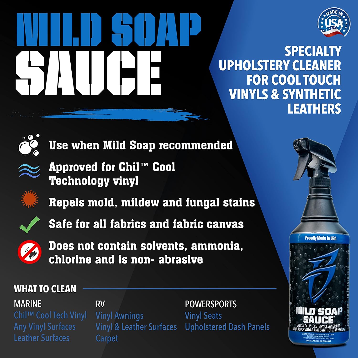 - CLEAN WITH CONFIDENCE – If you have “Chil” Cool-Touch vinyl, synthetic leather or other specialty upholstery, Mild Soap Sauce is your only effective cleaning option. The proprietary formula was developed in partnership with leading OEM vinyl and upholstery manufacturers to ensure compliance with factory warranty.