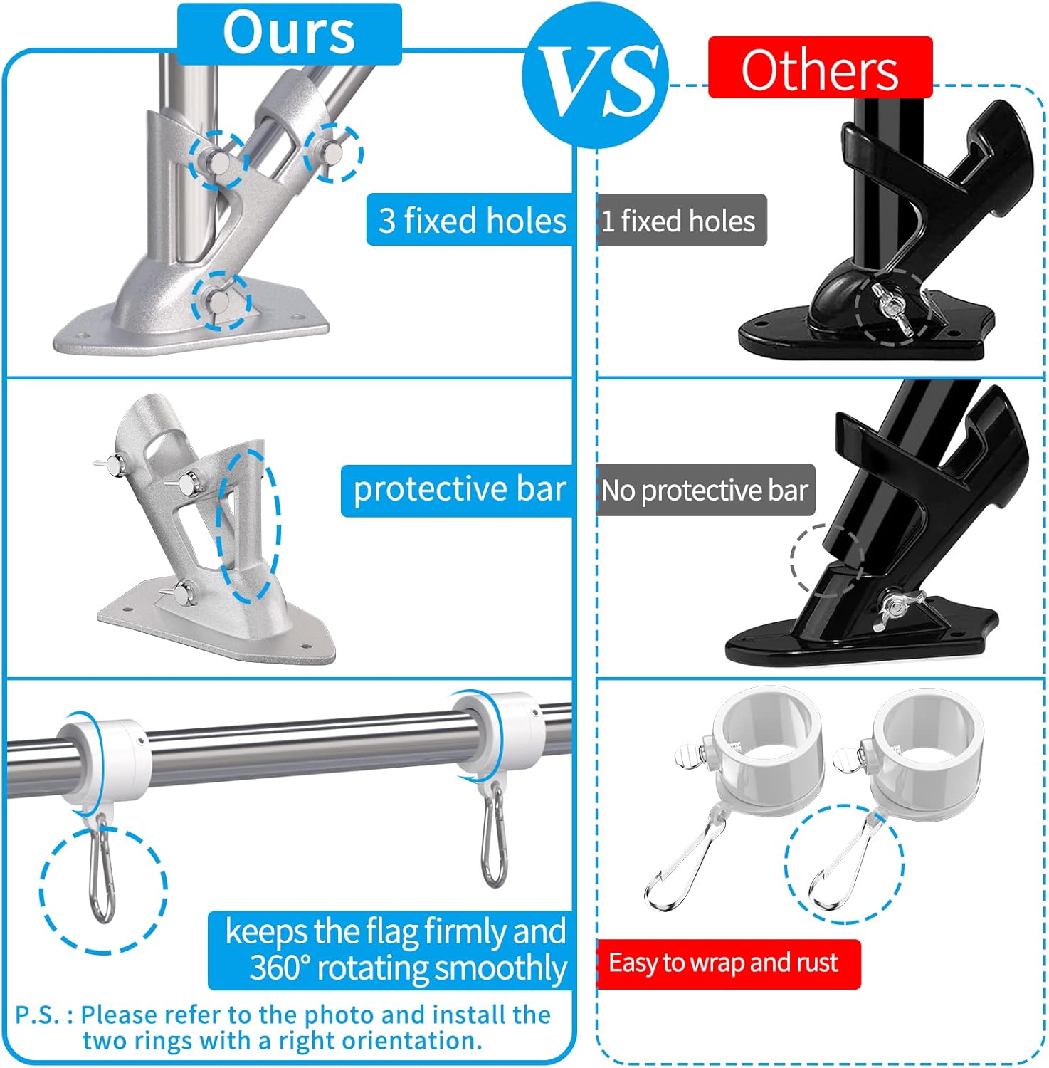 - Exquisite Design: 2*Flag Poles Diameter 1'', 2*Upgraded Brackets, 4*New Tangle Free Rings, 6*Carabiners, 2*Top Balls, 1*Installation Manual