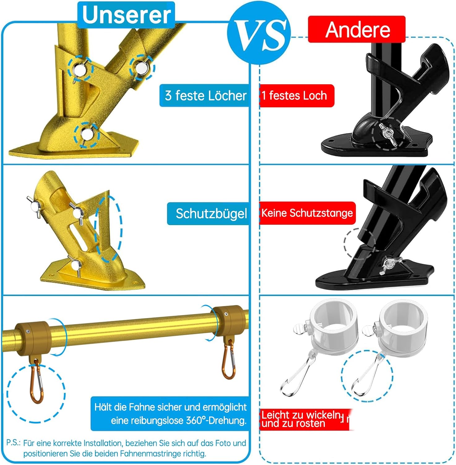 - Exquisite Design: 2*Flag Poles Diameter 1'', 2*Upgraded Brackets, 4*New Tangle Free Rings, 6*Carabiners, 2*Top Balls, 1*Installation Manual