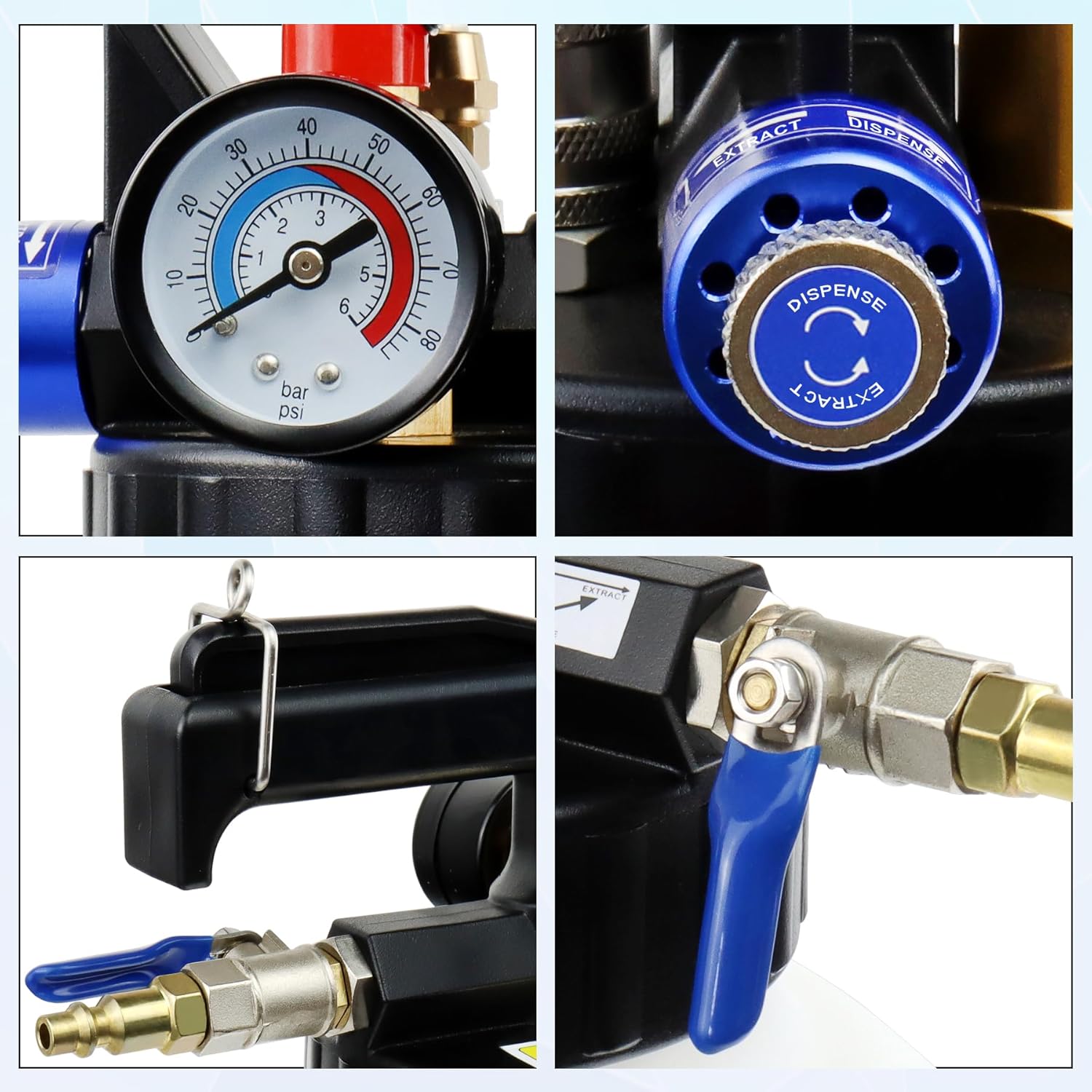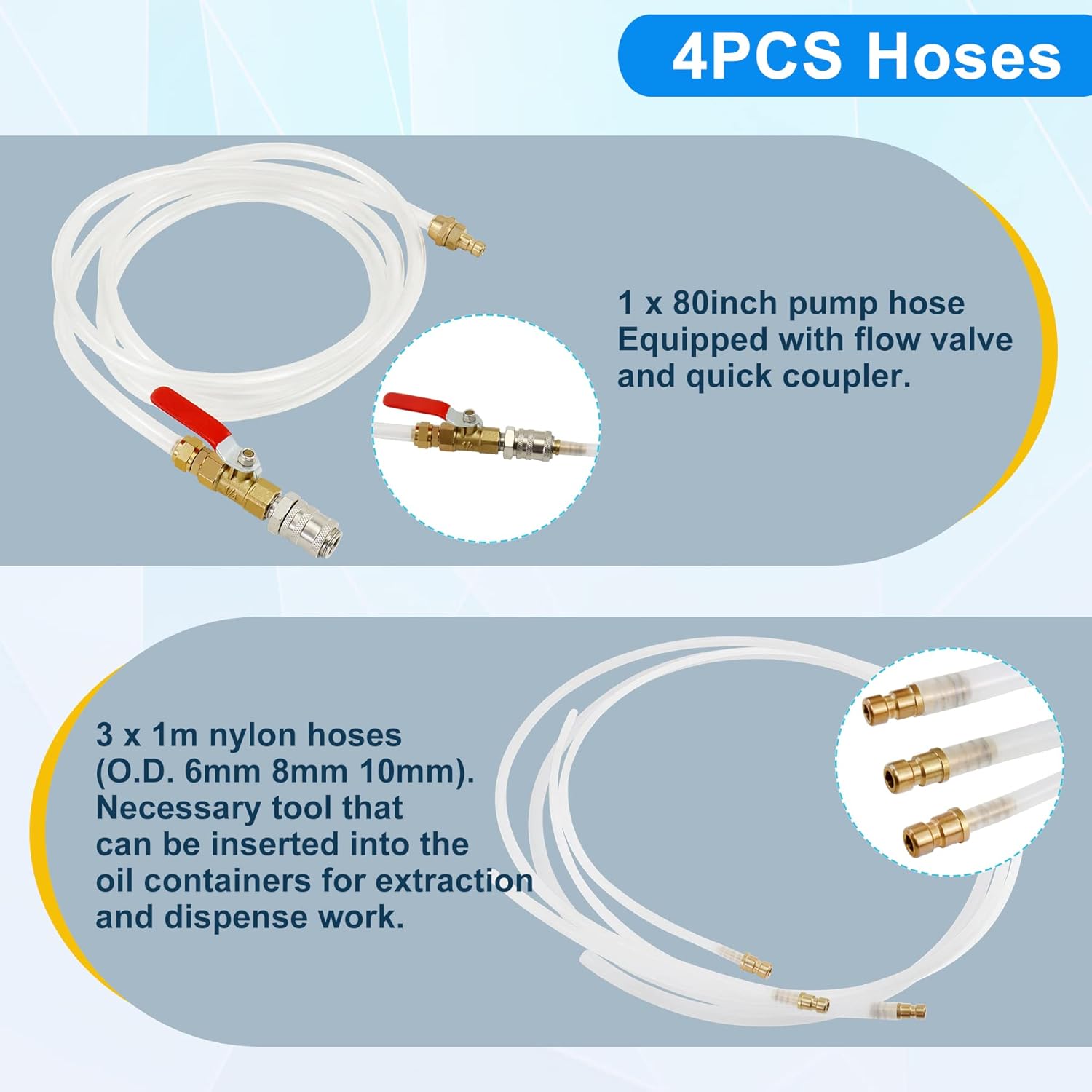 • 3PCS 1M Hoses: O.D. 6mm 8mm 10mm. Connect both ends of the 80'' hose with quick coupling to pump and the selected nylon hose first. They make the pump more suitable for various makes and models. The blue knob must be consistent with the air control switch valve: Extract or Dispense. The 1M nylon hose can be inserted into the car oil container or dipstick hole directly to extract waste oil for recycle and dispense the new oil for refilling. No need to jack up the vehicle and crawl under it
