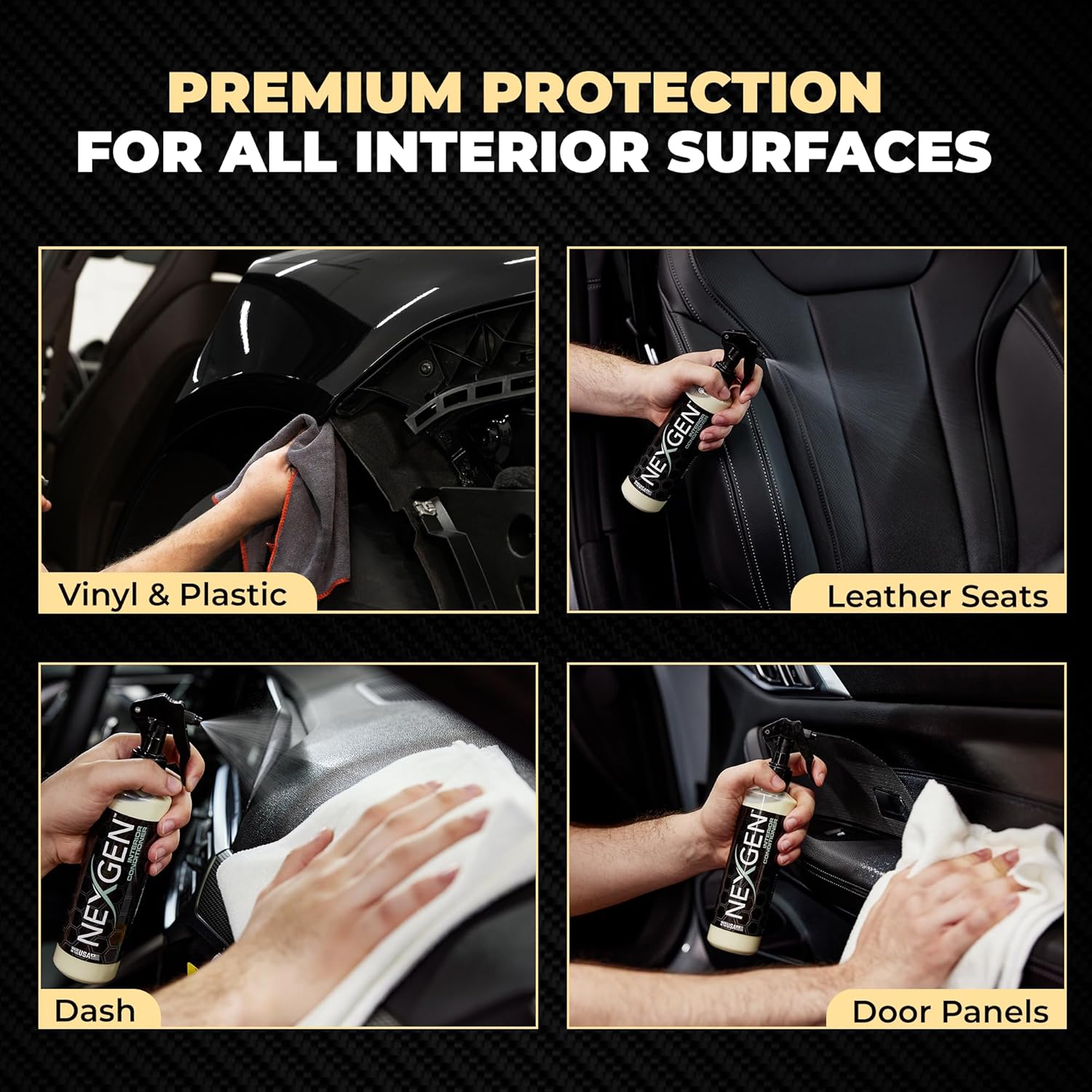 - Ultimate Interior Protection: Protect your interior from dirt, water, spills, and daily wear with Nexgen’s premium water-based Interior conditioner. Blending exotic oils, silicones, and emulsifiers, it effortlessly cleans and safeguards your car’s interior, keeping it looking fresh and refined.