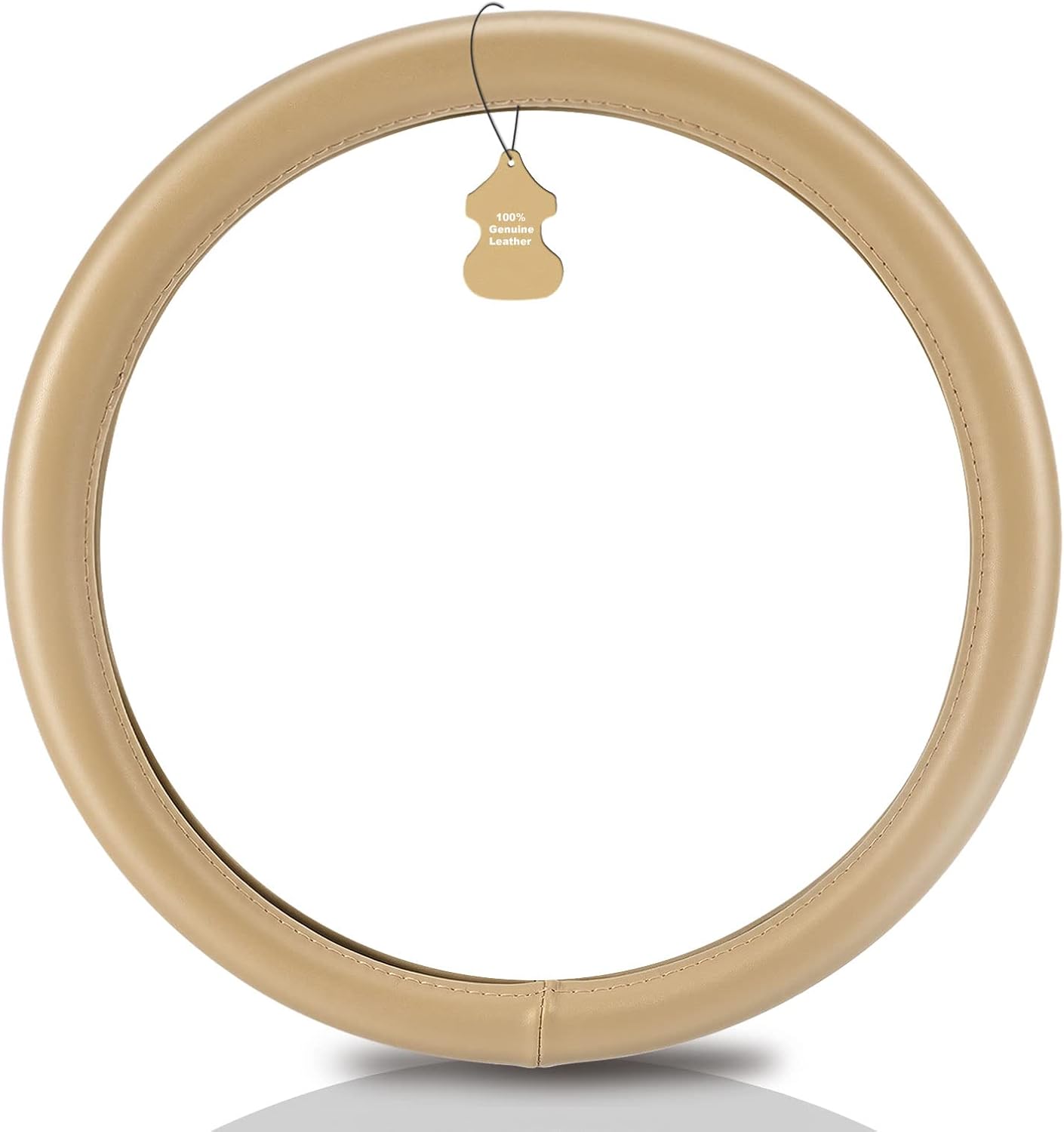 Haokay Heavy Duty Pure Cowhide Steering Wheel Cover SUV Car, Beige Genuine Leather Steering Wheel Cover Men Women Universal 14.5 to 15 Inch