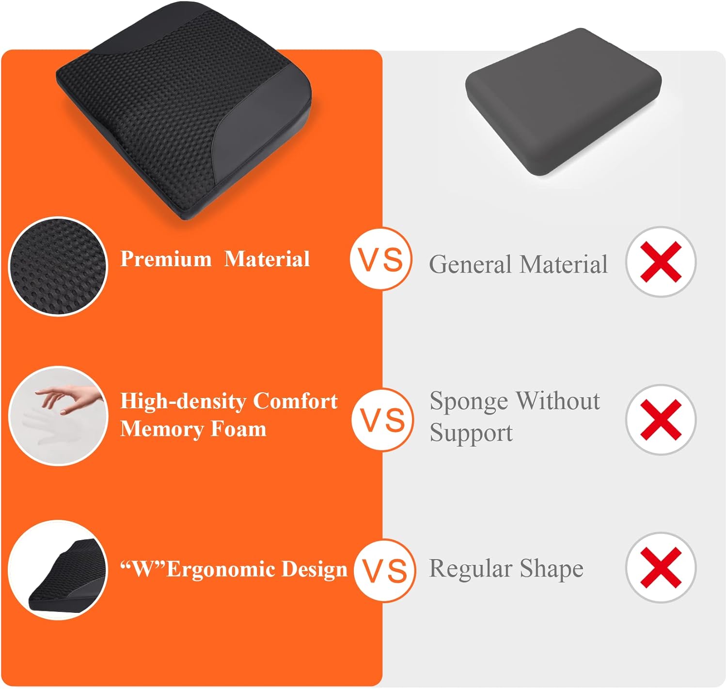 - Ergonomic Car Cushion - Our seat cushion for car seat driver provides maximum support and comfort for your back and hips. Besides, our cushion could help form a correct posture to relieve fatigue or pain caused by sitting too long. The W-shaped seat cushion for car can closely fit the curve of your legs for comfortable driving