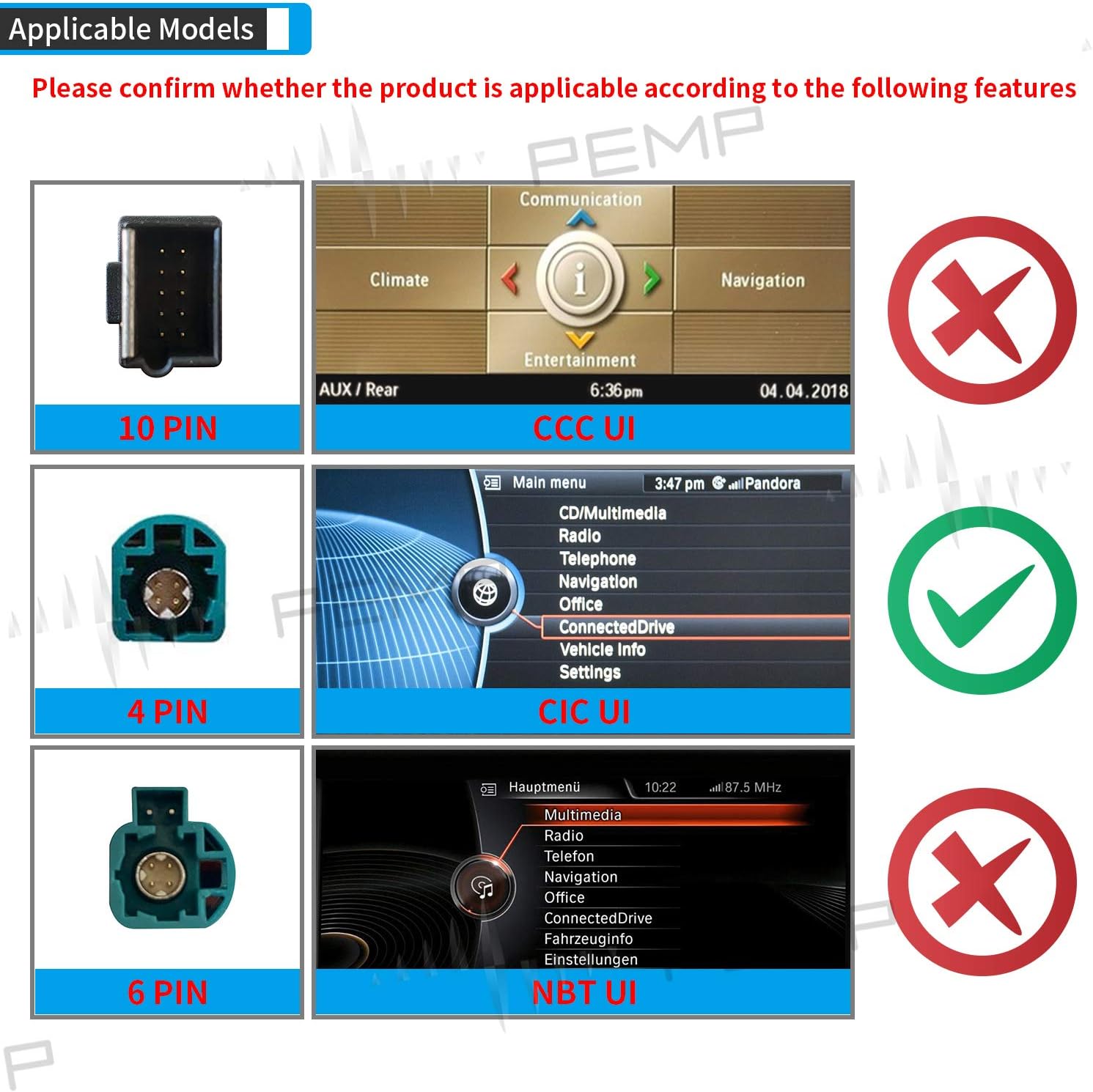 - [VERTICAL SCREEN] Vertical screen style, Parallel with eye line of sight, that is safe and comfortable; easier to touch. Only suitable for BMW E70 E71 X5 X6 CIC original 4PIN LVDS system.