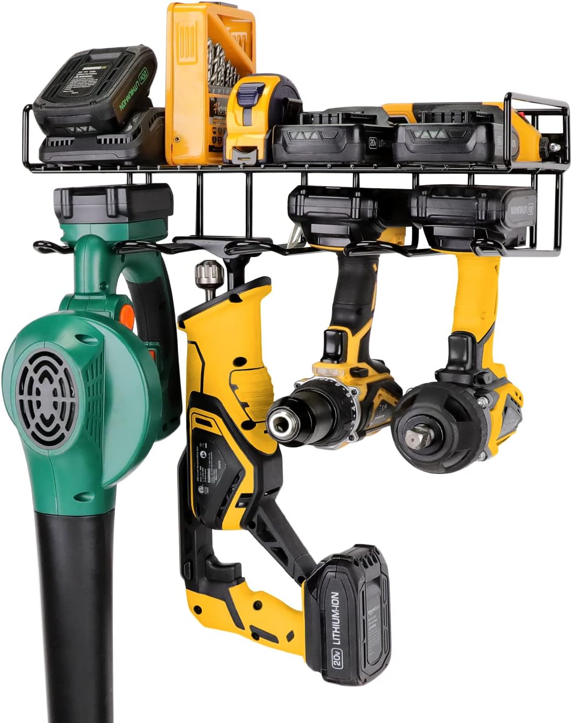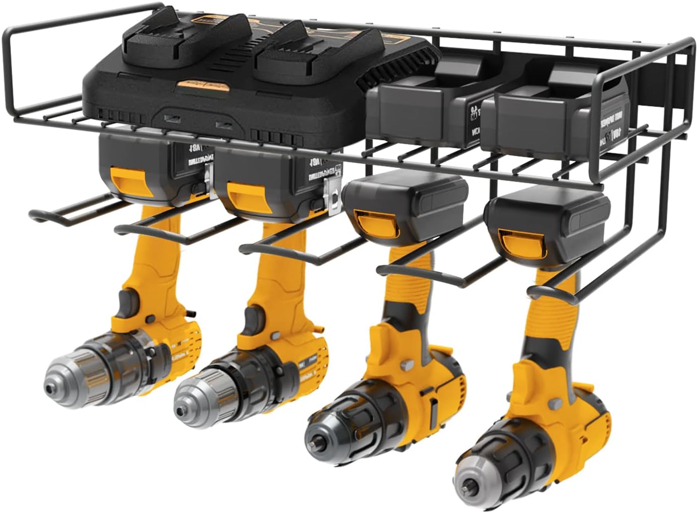 - High Load Capacity: The power tool storage made of heavy gauge steel wire and high gloss power coating. The cordless drill tools organizer has an extra heavy weight limit of 100 pounds. Has 4 storage slots plus shelf for chargers, batteries, and drill bits