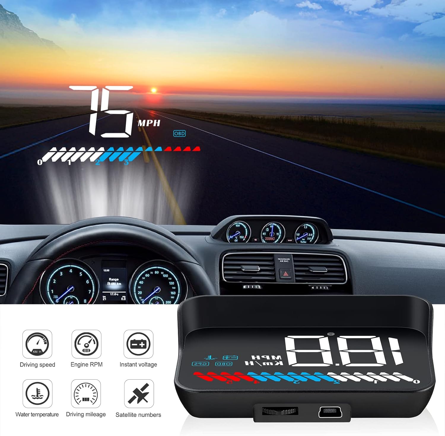 - MULTI FUNCTION DISPLAY--- In the OBD mode, it can display: speed, water temperature, voltage, driving distance, with the functions of speed alarm, water temperature alarm, voltage alarm, etc.GPS mode can display: speed, voltage, driving distance, with speed alarm , voltage alarm function. HUD can automatically adjust the brightness according to the environment. Speed unit: km / h or MPH. The unit of water temperature is degrees centigrade and degrees Fahrenheit. The unit is adjustable.