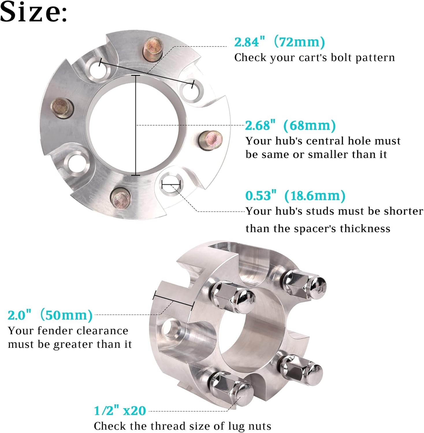 - Size: 2" (50mm) thickness, 4 x 2.8" (72mm) bolt pattern, 3.68 " (68mm) hub center bore, and 16 pcs 1/2"-20 external nuts (internal use of original nuts).