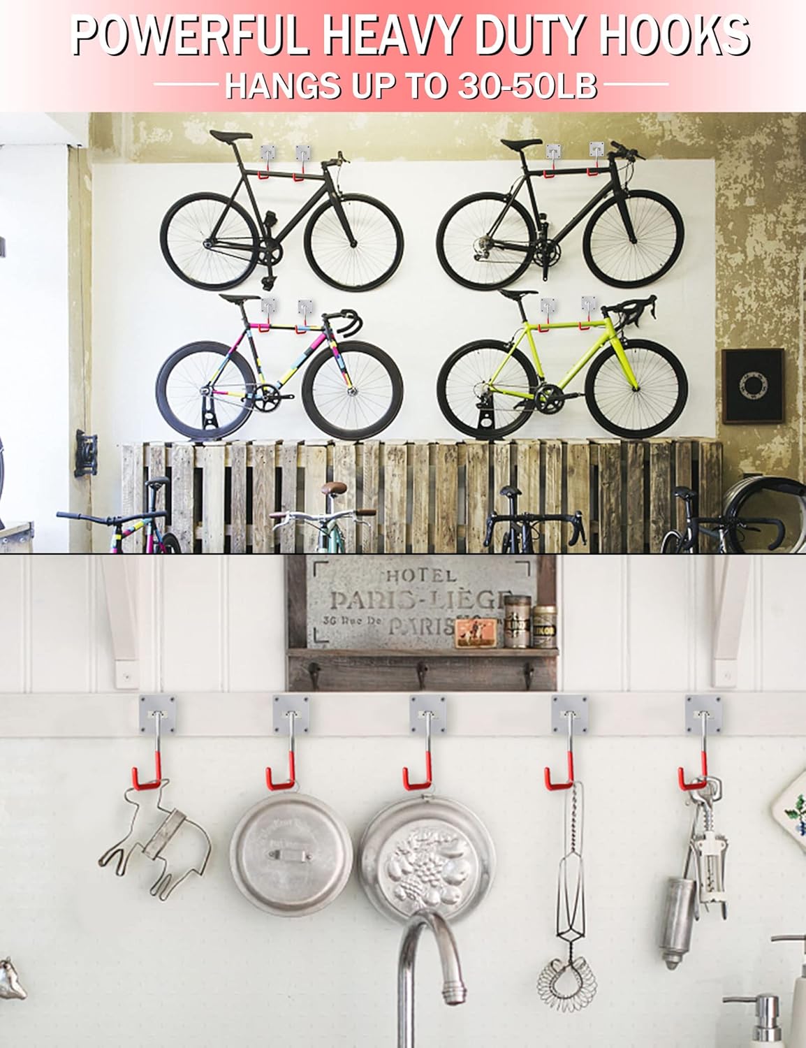- EASY TO INSTALL: These garage hooks are applicable to all kinds of walls and wood materials and other installation surfaces.Three easy steps: 1) Mark two small holes on the wall; 2) Fix the white plastic anchor to the desired; 3) Twist the steel screw nail into the anchor.