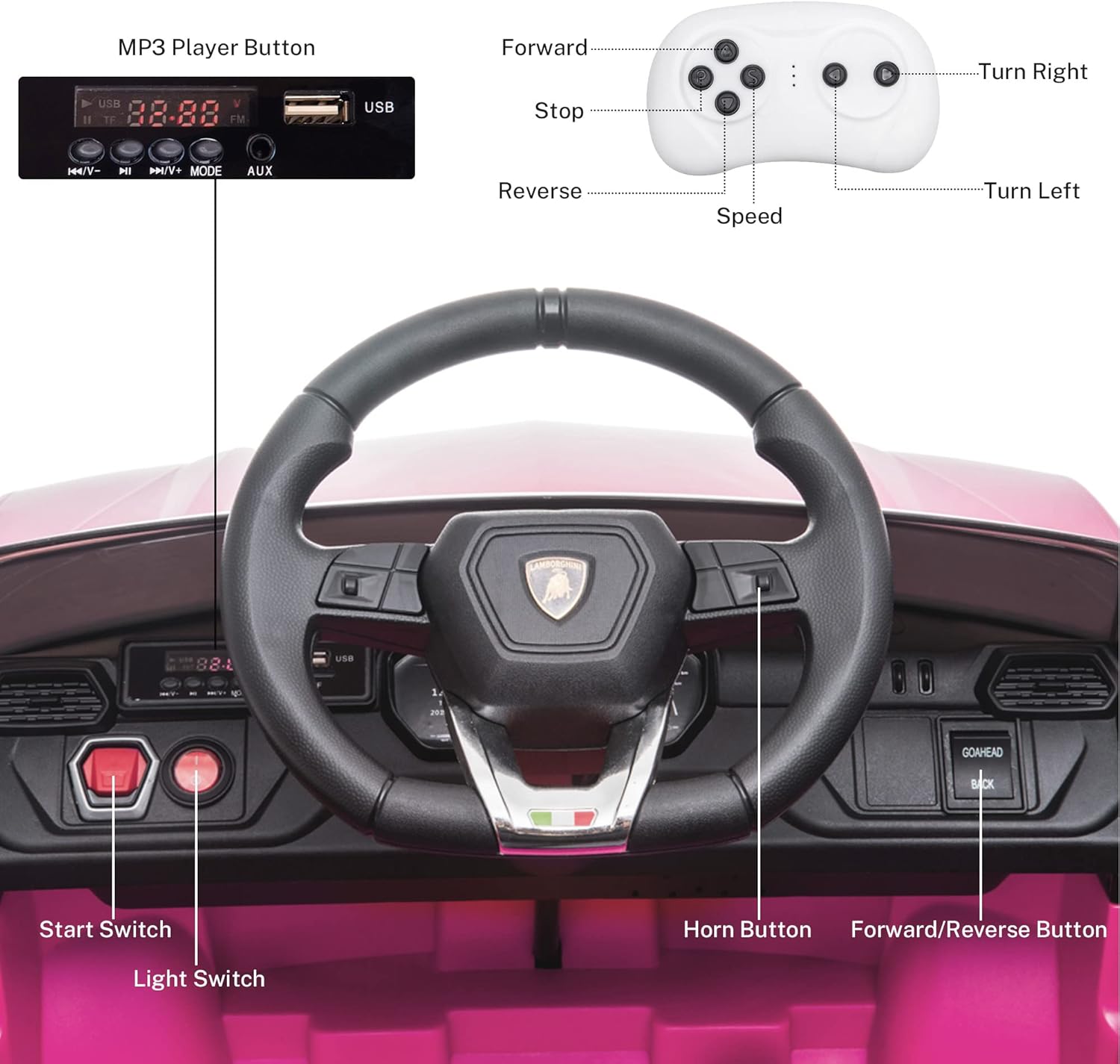 Kids Electric Ride On Car for Kid, 12V Licenced Lamborghini Kids Electric Vehicles with Remote Control, AUX, Spring Suspension, Music, LED Lights, USB Port, Foot Pedal (Pink)