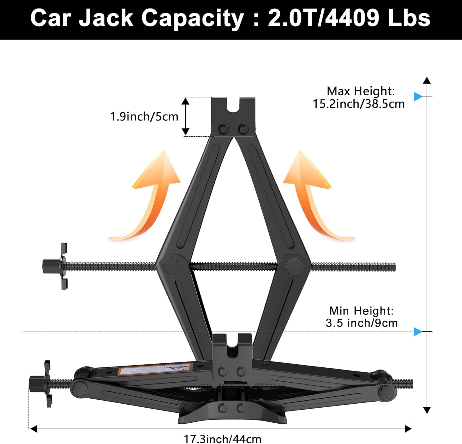 - 【 Load Capacity 】Max Load weight: 2.0 Ton (4,409 lbs),Car Lifting Range from 3.5" (89mm) to 15.2"(385mm). Car Jack Net weight 4.84 lbs (2.2kg).