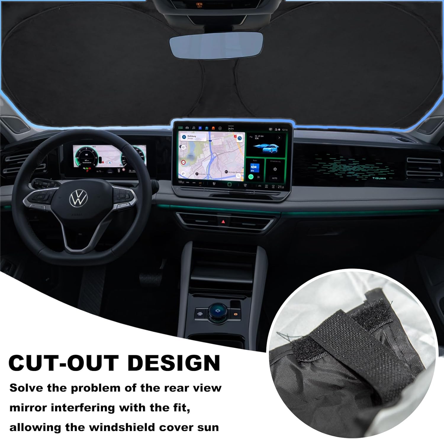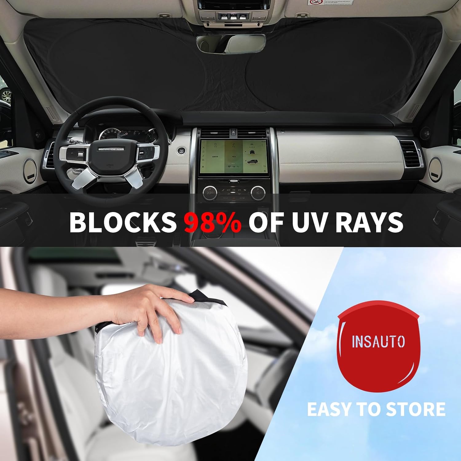 - ➤【Super Easy Installation】--Just need Out popped the Sunscreen Shield,put it on the interior front window, Put down the car sun visor to hold the sunshade, use the Velcro Strap to rear view mirror TO Hold It In Place. Never worry about it moving again. The specific installation steps refer to our video.