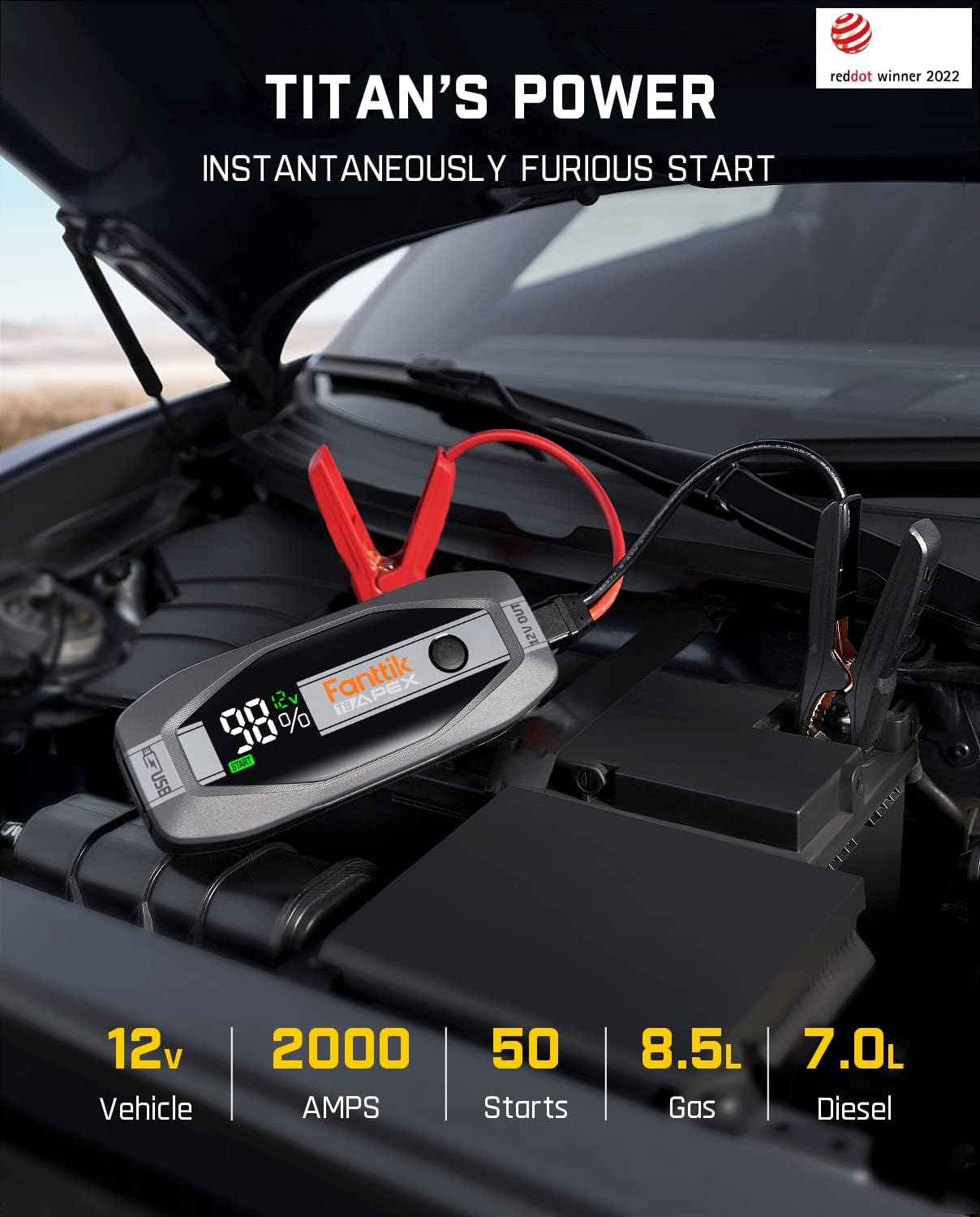 - [Titan's Power] With Titan’s jump starting power for instantaneously engine starts. Rated at 2000 Amps, this lithium car battery jump starter unleashes maximum energy to start your dead battery, especially for your supercar up to 8.5L gasoline engines and 6.0L diesel engines.