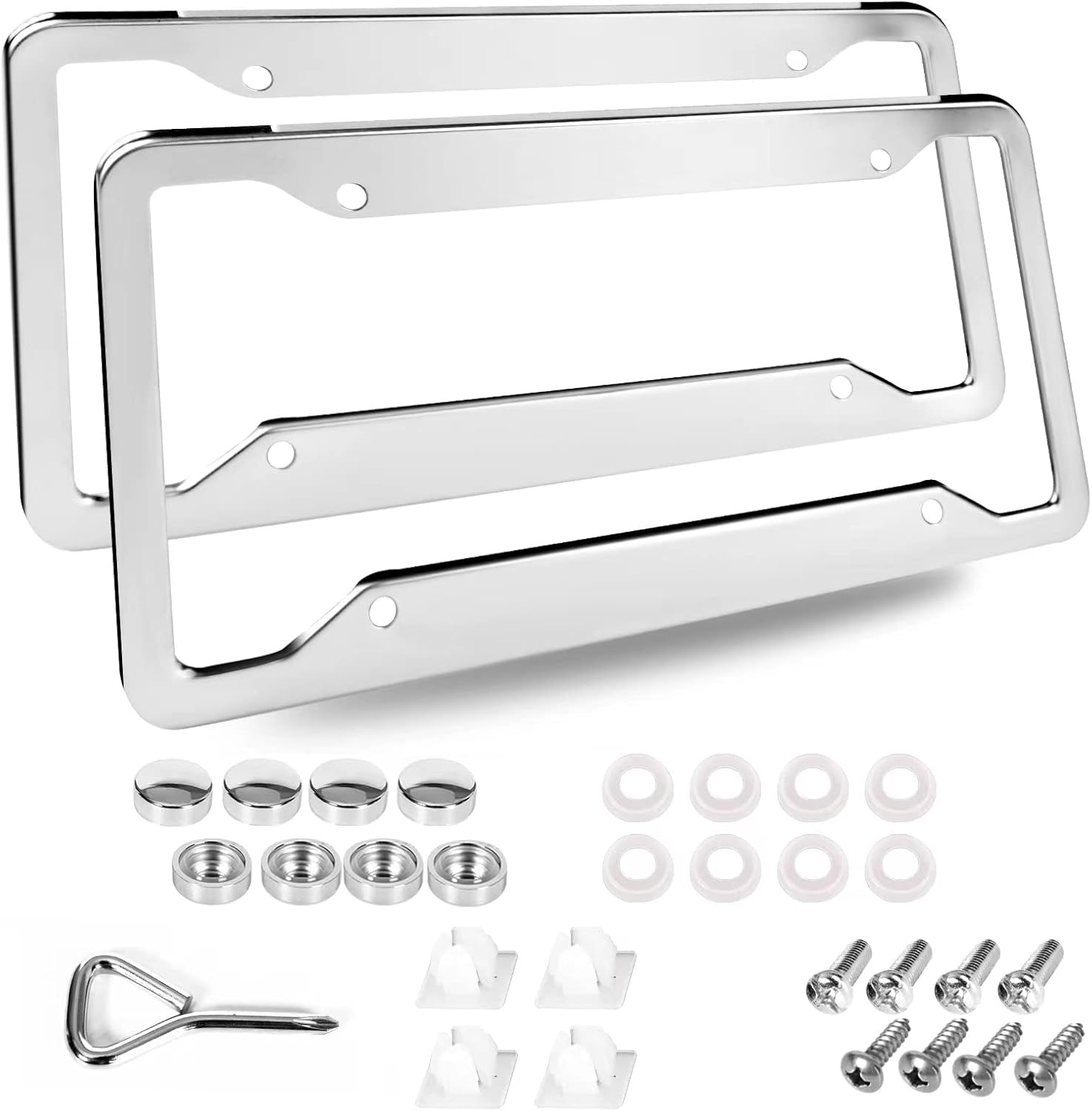 2 Pcs 4 Holes Stainless Steel License Plate Frame,Car License Plate Holder Bracket with Mount Hardware ,Screw, Caps Cover Set Car Accessories