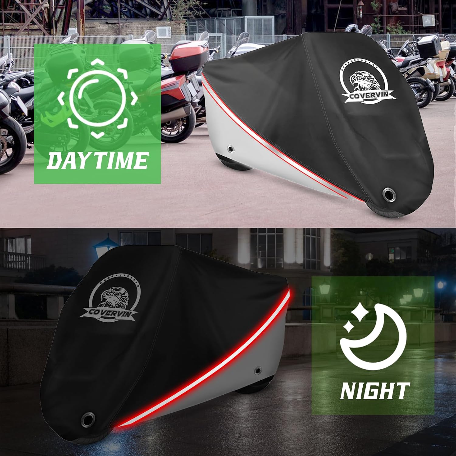 COVERVIN Motorcycle Cover, All Weather Outdoor Waterproof Night Protection with Reflective Strips, Locking Holes and Storage Bag for 96 Inch Suzuki, Kawasaki, Honda, Harley-Davidson(Silver XL)