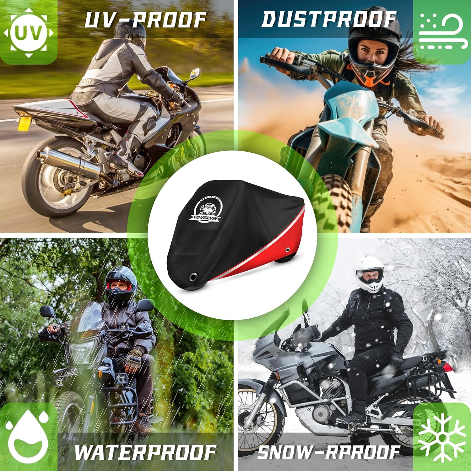 - Heavy Duty Oxford Fabric: Made of 210D premium polyester fabric, lightweight, super soft and designed with double stitching to be more waterproof than ordinary materials.Keeps your motorcycle completely dry and clean, even in the rain