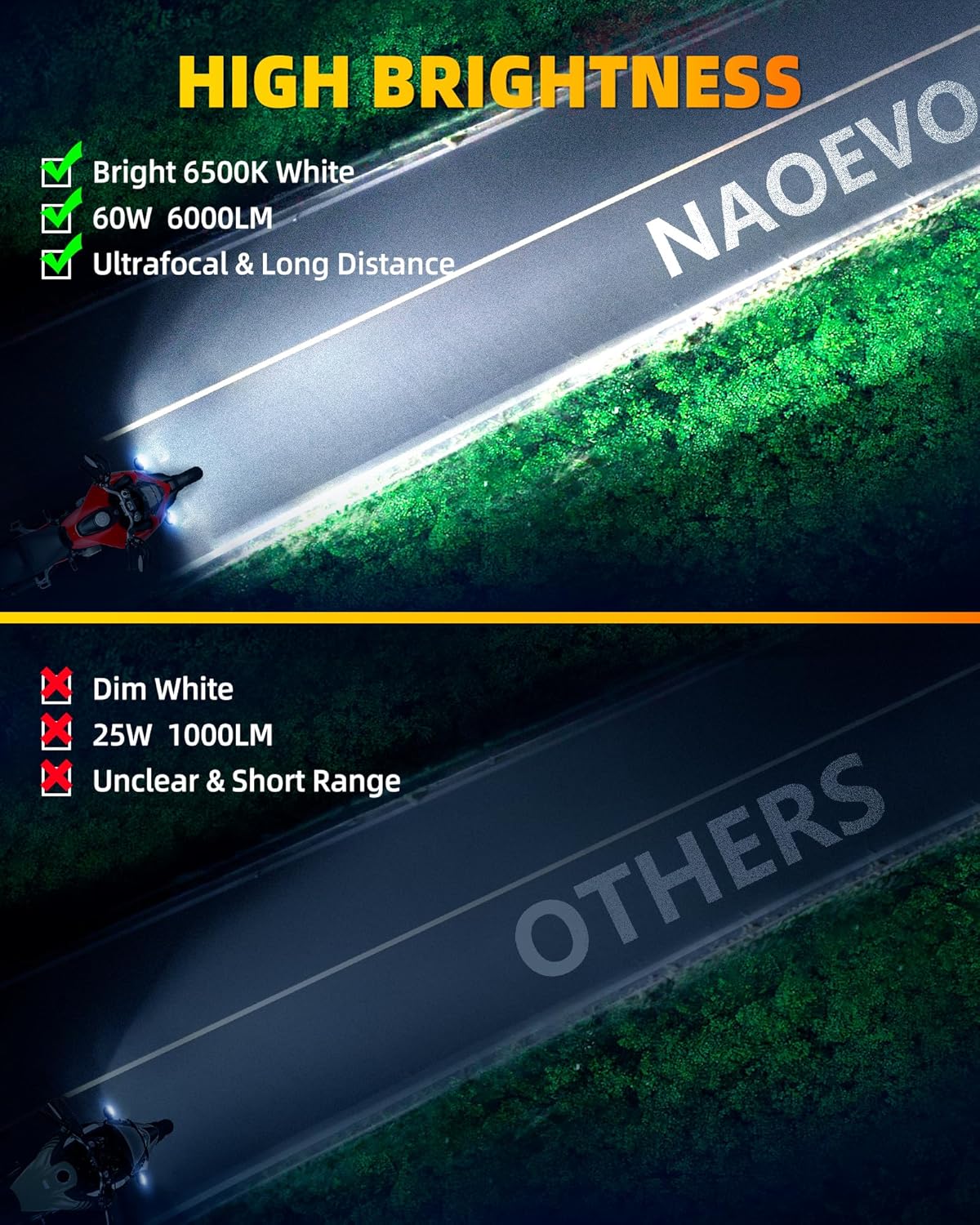 - [EASY DEFEAT THE DARKNESS] - NAOEVO led fog lights uses super bright light chips, whether it is lemon yellow light, white light, spotlight or floodlight all adopts superior-quality LED chips, achieves long distance irradiation (spotlight) and wider illumination range (floodlight).