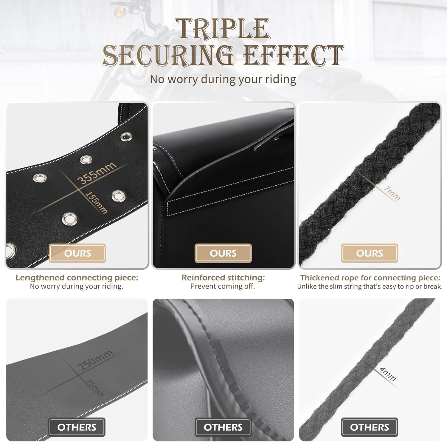- ★【Strengthen Stability】: To improve adjustability & durability, our motorcycle leather saddlelbags use reinforced extended saddle piece and thickened rope, this will compatible with most size of rear seat,and effectively keep stable at high speed riding.
