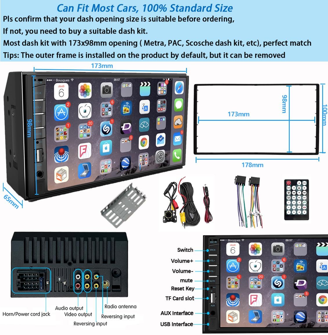 - ăCar Stereo Sizeă7-inch in-dash head units with a minimal front panel size of 171(L)*65(W)*97(H)mm/6.73(L)*2.56(W)*3.82(H)in (fitting the mounting frames commonly available). If needed, an extra frame adapter is also included to expand it to 178(L)*65(W)*100(H)mm/7.01(L)*2.56(W)*3.94(H)in.