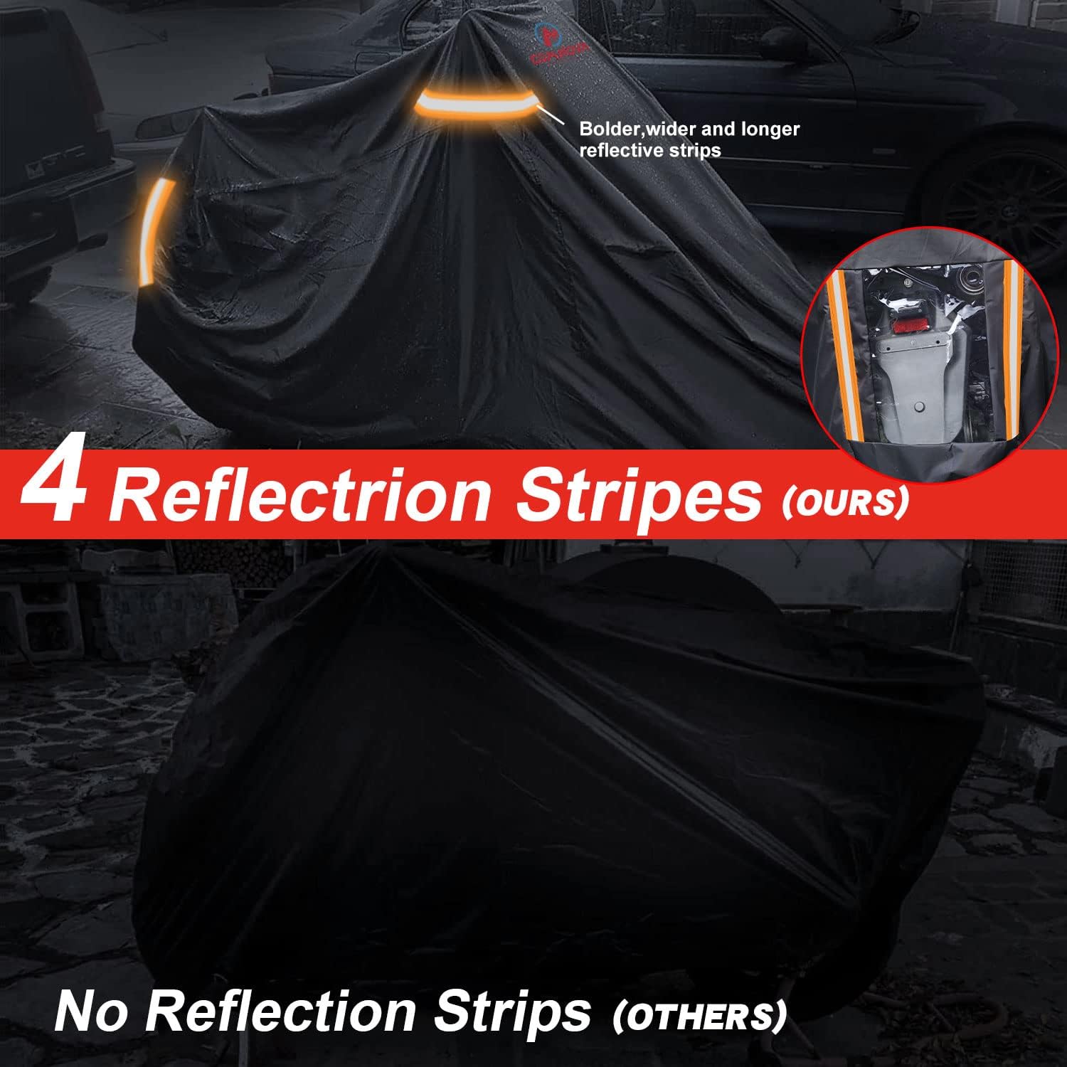 - 【4 NIGHT REFLECTIVE STRIPES】 Comnova motorcycle cover comes with 4 reflection stripes. Two at the front and the other 2 at end sides. The bright color also decorates the motorcycle cover. The motorcycle cover also have transparent license plate design, it is easier to find your motorcycle in dark.