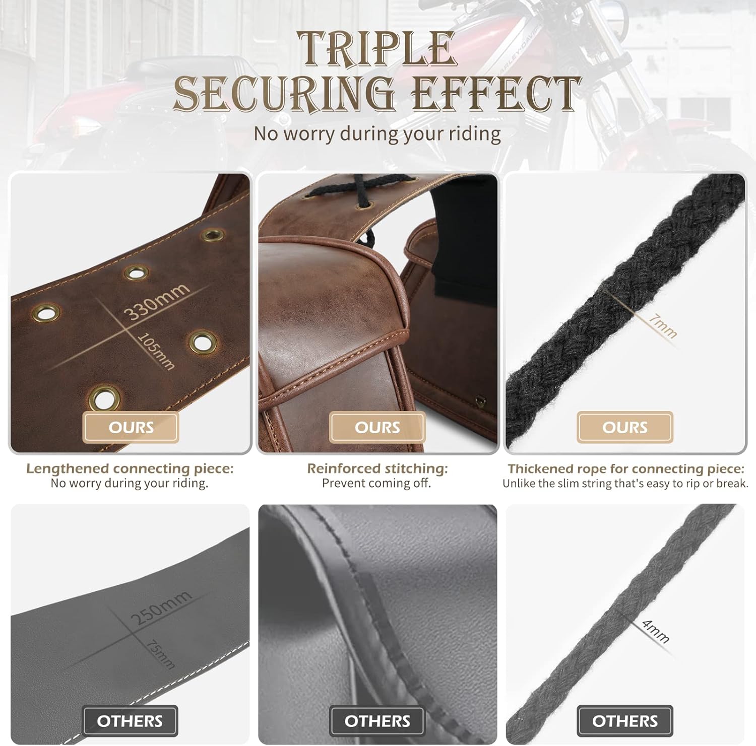- ★【Strengthen Stability】: To improve adjustability & durability, our motorcycle leather saddlelbags use reinforced extended saddle piece and thickened rope, this will compatible with most size of rear seat,and effectively keep stable at high speed riding.