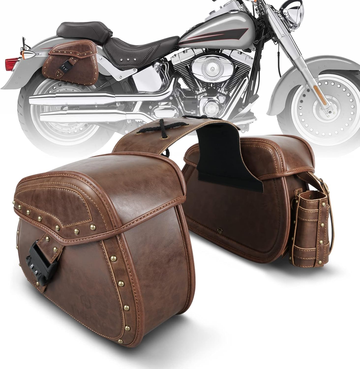 NICECNC Motorcycle Saddle Bags, PU leather Motorcycle Saddlebags, Reinforced Straps & Saddle Piece, with Cup Holder & Lock, Throw Over Saddle Bags Side Bags Universal Motorcycle Accessories, BROWN