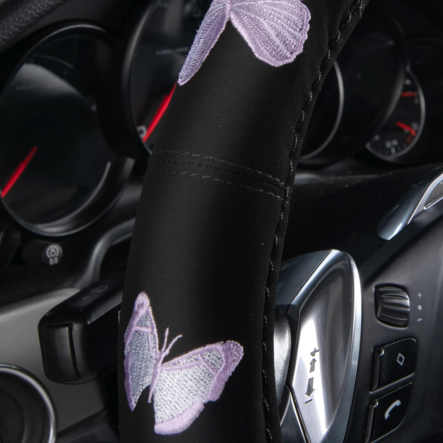 Car Pass Purple Embroidery Butterfly Steering Wheel Cover, Universal 15 Inch Car Wheel Cover for Women Girls, Fit for Suvs,Small Trucks,Sedans,Cars (Black and Purple)