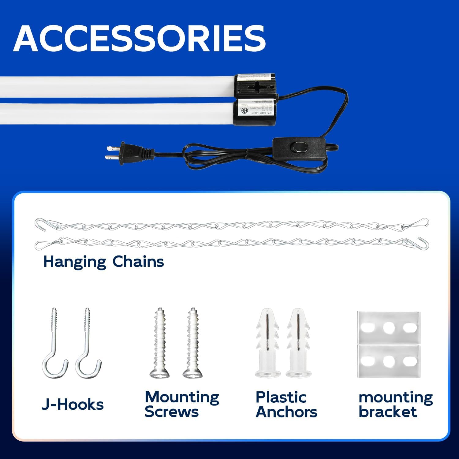 - β Easy Installation - Plug & Play. Come with 59" power cord with on/off switch and other small accessories. You can hanging it with the included hanging chains or directly mounted to the ceiling with the included mounting screws.