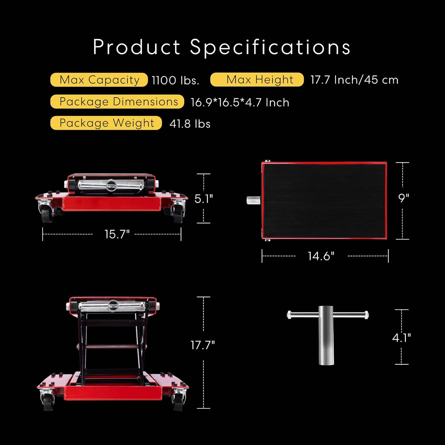 - HIGH PERFORMANCE - With a max load capacity of 1100 lbs., the lift jack can raise motorcycles to a comfortable level for your work between 5.1"-17.7" (with dolly) or 3.75"-14.95" (without dolly); The jack itself can be simply lifted out of the dolly tray and set on the ground; It is perfect to use in the garage, shop or at the track