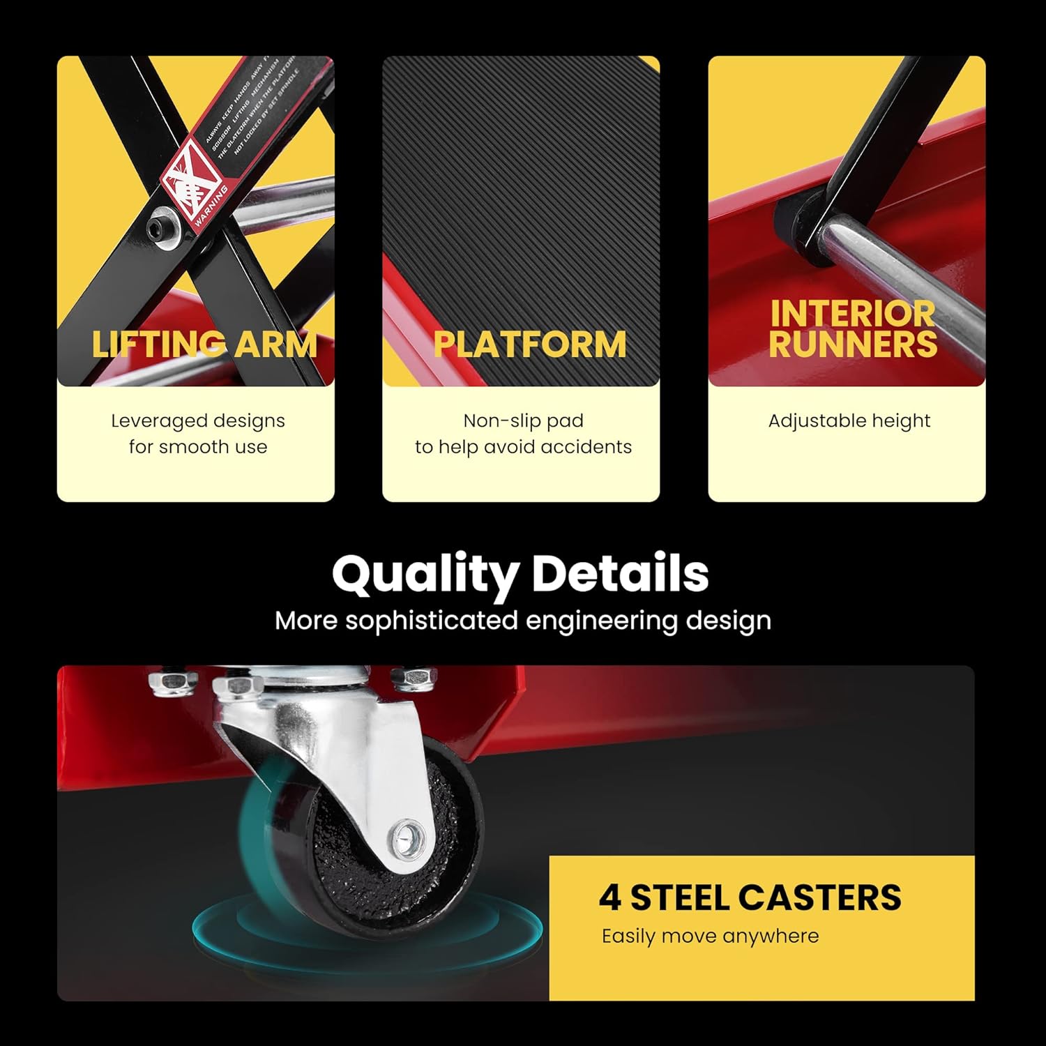 - MOVABLE & VERSATILE APPLICATION - The lift jack with dolly tray which has 4 steel casters can be easily moved anywhere; It fits transmission and most motorcycle models like cruisers, trikes, Can Am Spyders, ATVs, UTVs, dirt bikes, snowmobiles, etc.; The portable design can save a lot of space, and you can put the stand in a small and compact space after use, such as a locker, corner, closet, garage, and so on