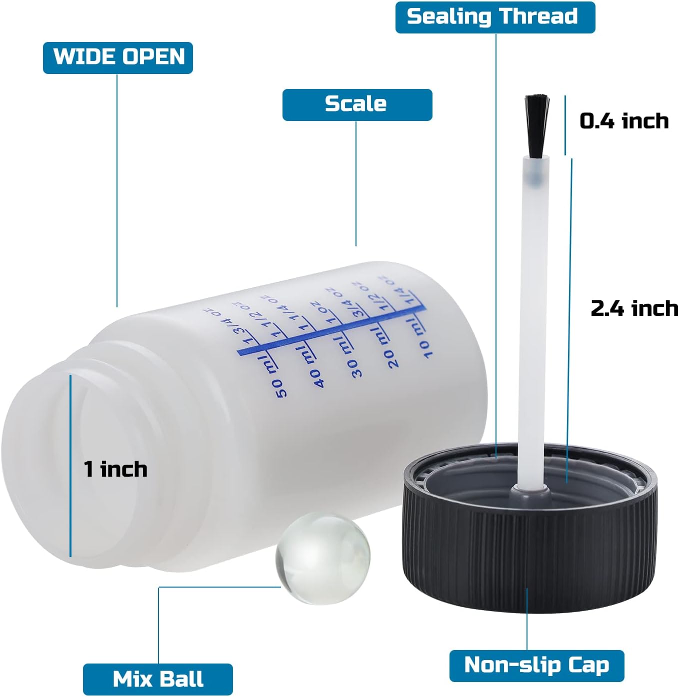- Visible Scale: All of bottles are marked with a liquid scale so you can add the right amount of liquid to your project to avoid wastage, and the brush bar is built into the cap to prevent liquid from running back and getting your fingers dirty