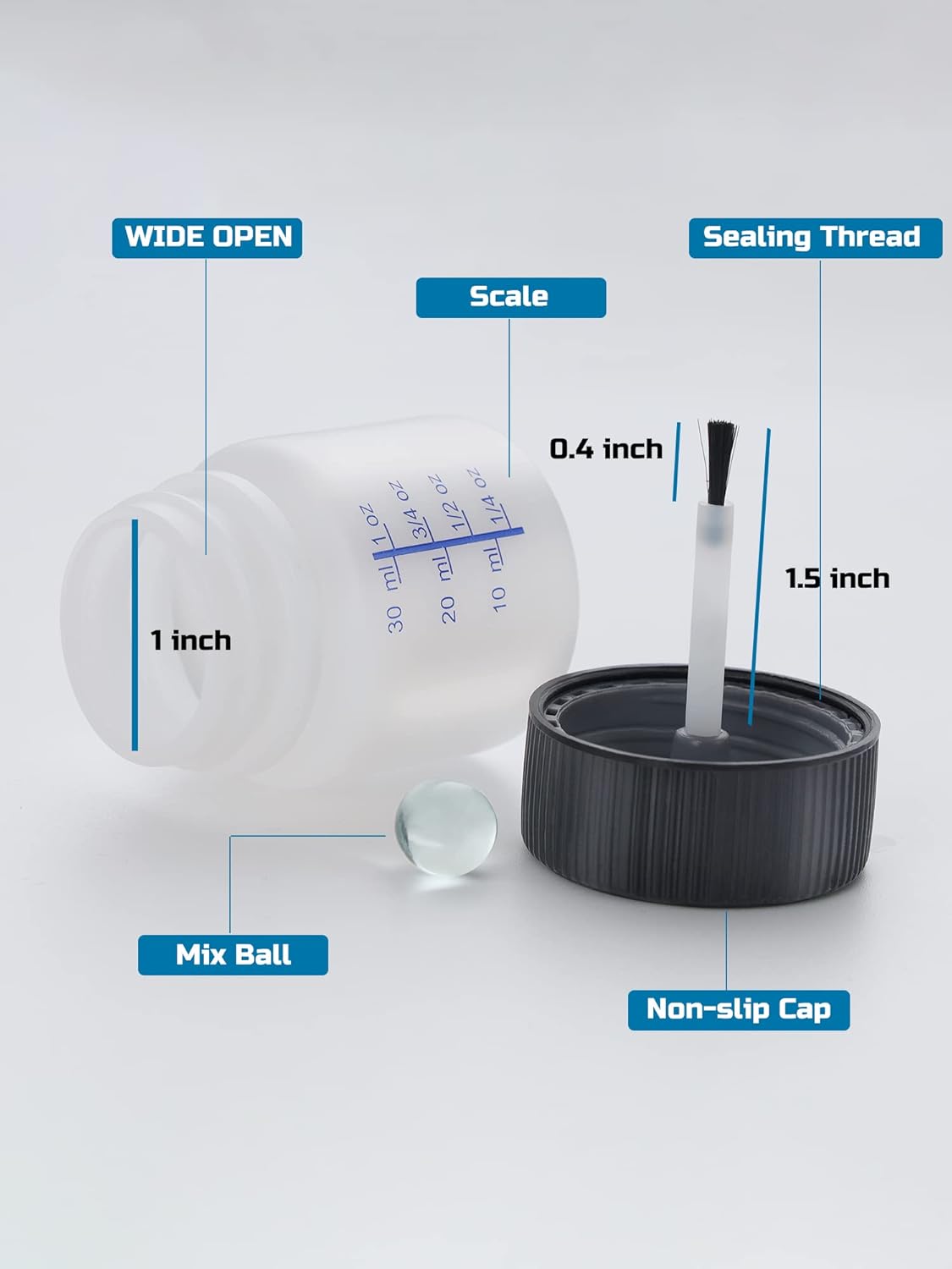 - Visible Scale: All of bottles are marked with a liquid scale so you can add the right amount of liquid to your project to avoid wastage, and the brush bar is built into the cap to prevent liquid from running back and getting your fingers dirty