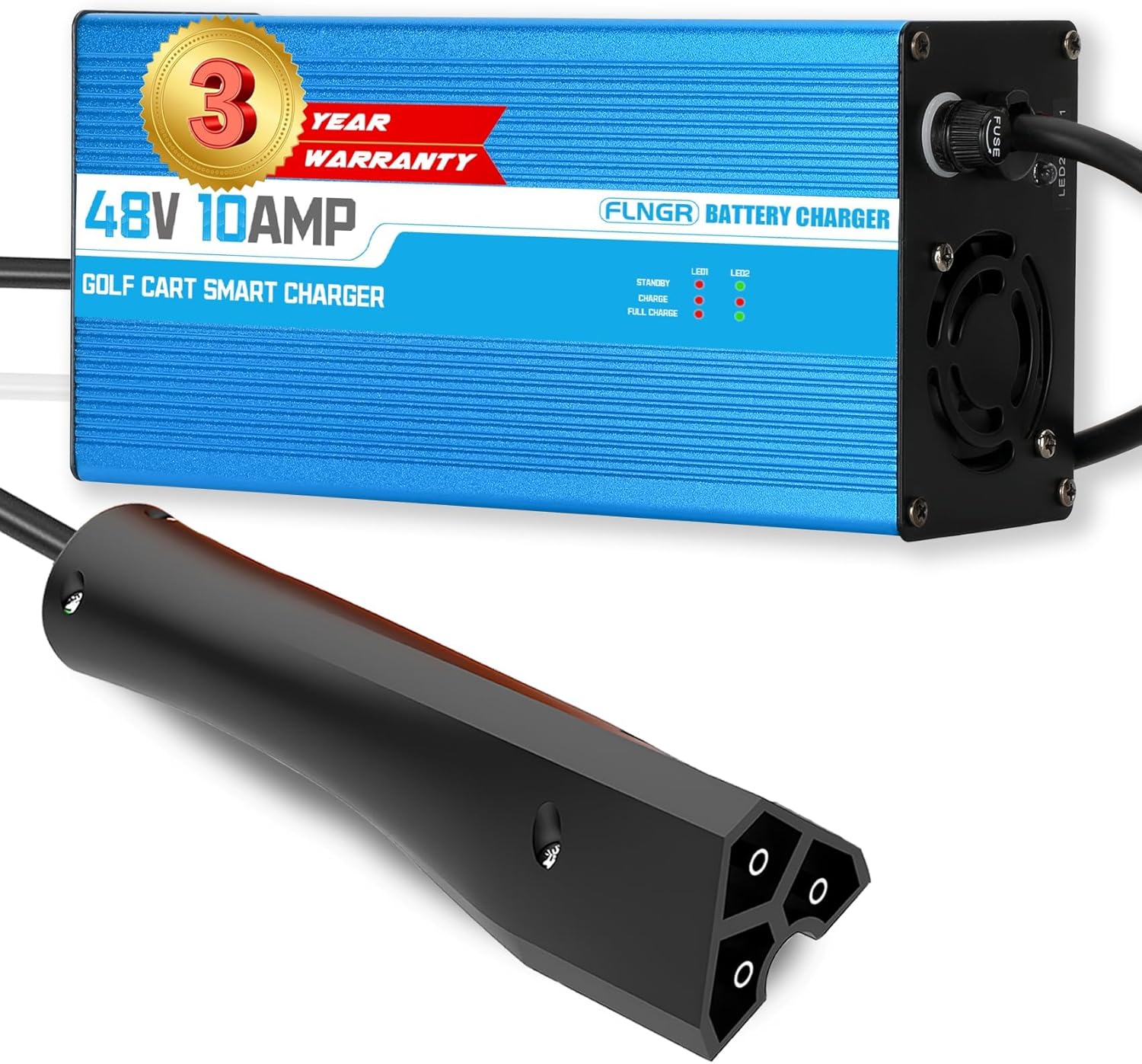 - 【CHARGING FASTER THAN LIGHTNING⚡🚀】【FAST CHARGE】Flngr 48 Volt Golf Cart Battery Charger speed of the 10A golf cart charger is 2 times that of the 5A charger. You can spend less time charging your cart.Flngr Smart Charger has built-in four-stage charging technology to ensure 100% battery life.