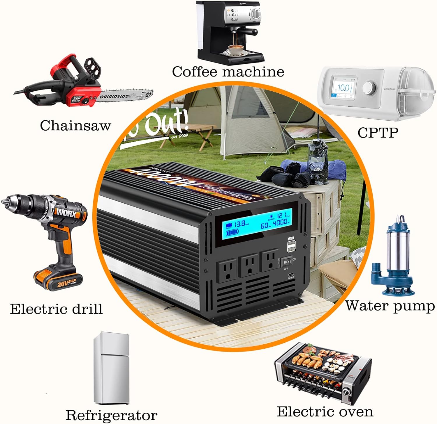 - ☀ This is a 12 volt 4000 watt modified wave inverter that converts DC 12v to AC 110V/120V. Perfect for traveling, camping, tents, boat trips, working on the road, and anywhere without electricity! Just connect the power inverter to the battery and then to the device.