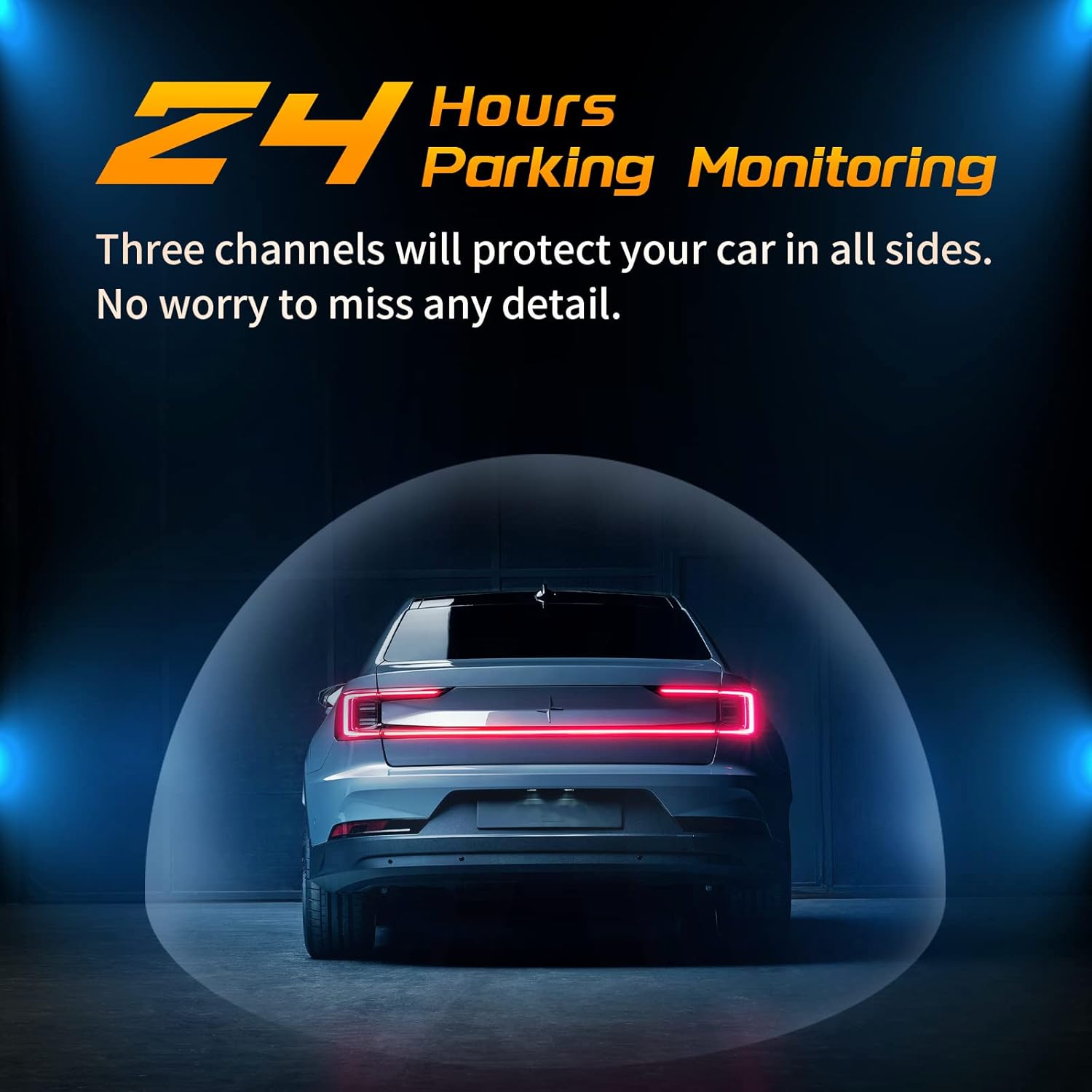 - ăBrilliant Parking MonitoringăWhen you park the car, the camera lens can adjust to left and right view. It will provide the side view of car, no worry your car will be scratched on the side. The dash cam automatically powers on (Three cameras will turn on together) and starts recording, thus providing you a video evidence if your car is scratched by someone in parking. We recommend to use the hard wire kit (Asin: B07Q29JZZY) installing your dash cam to make the dash cam 24 hours working for you.