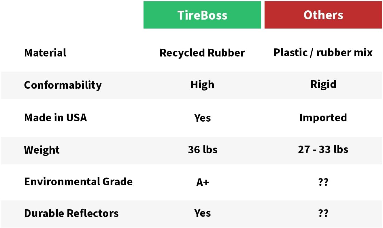 - RECYCLED. Wheel Stops are made from 100% recycled rubber car and truck tires. A mix of natural rubber and styrene-butadiene rubber is compression molded to form a durable, long-lasting alternative to traditional concrete or plastic stops. Our TireBoss parking stops are some of the “greenest” on the market. Each of our parking stops take 2-3 tires out of landfills in the USA and Canada. Unlike most others, we don’t use virgin rubber from China (which is an environmental calamity)!