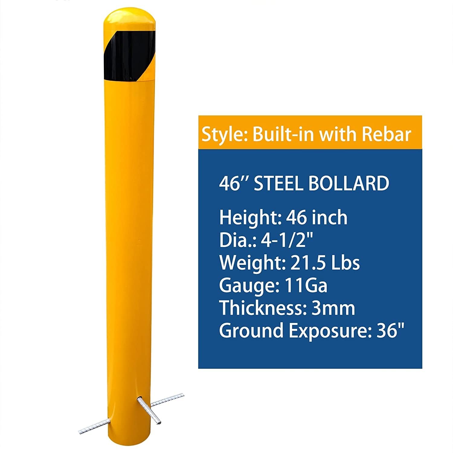 - BUITL-IN BARRIER BOLLARD: Steel pipe bollard can be permanently set in concrete. Embedded underground mount by a pair of rebar to reinforce in-ground installation and increase the stability and durability. The extra length of the pour In place bollard allows you to maintain the height of 36" after fixing the safety pipe in concrete;