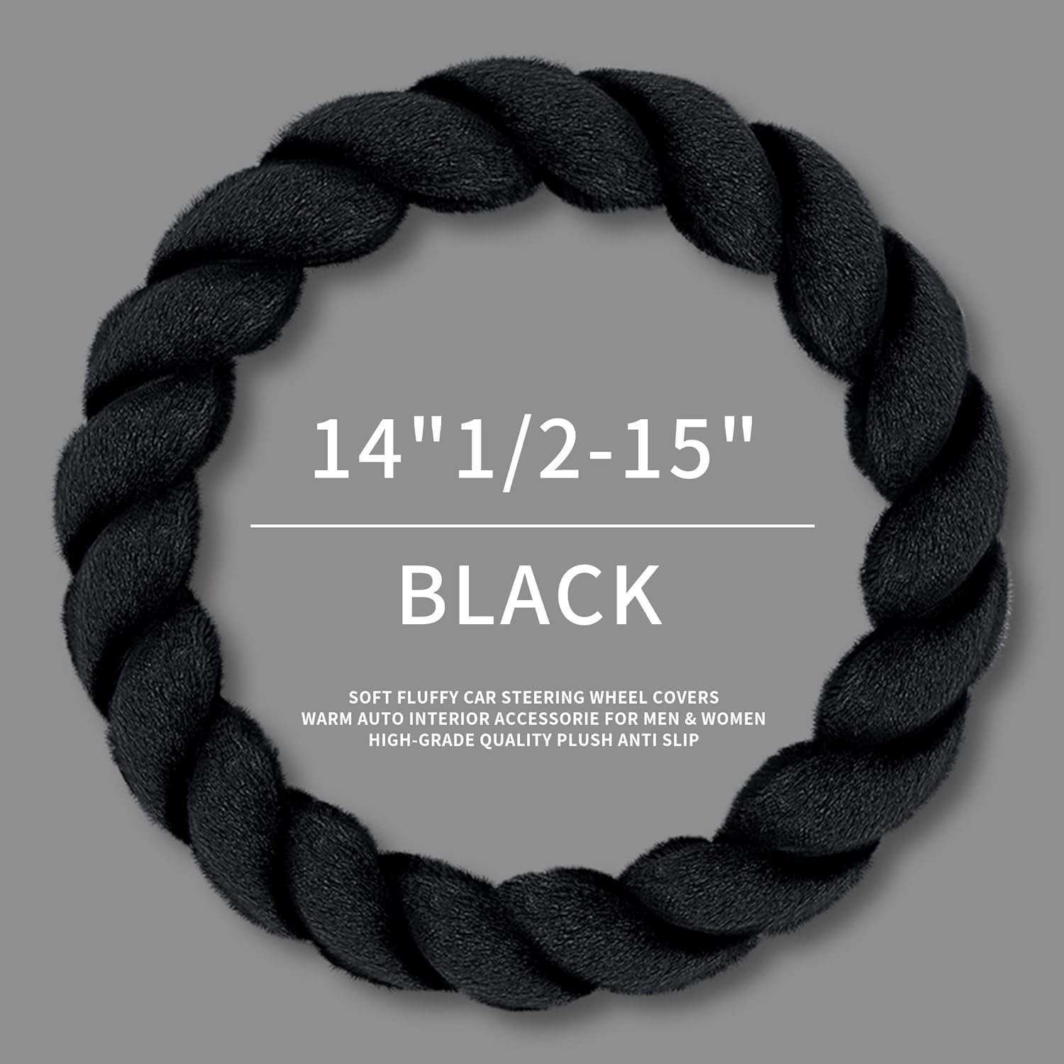 Luxury Fluffy Winter Car Steering Wheel Cover for Women Soft Warm Plush Cute Auto Accessories for Vehicle, Sedan, Universal, Fuzzy, Anti Slip, Black, Standard Size, 14.75-15.15"