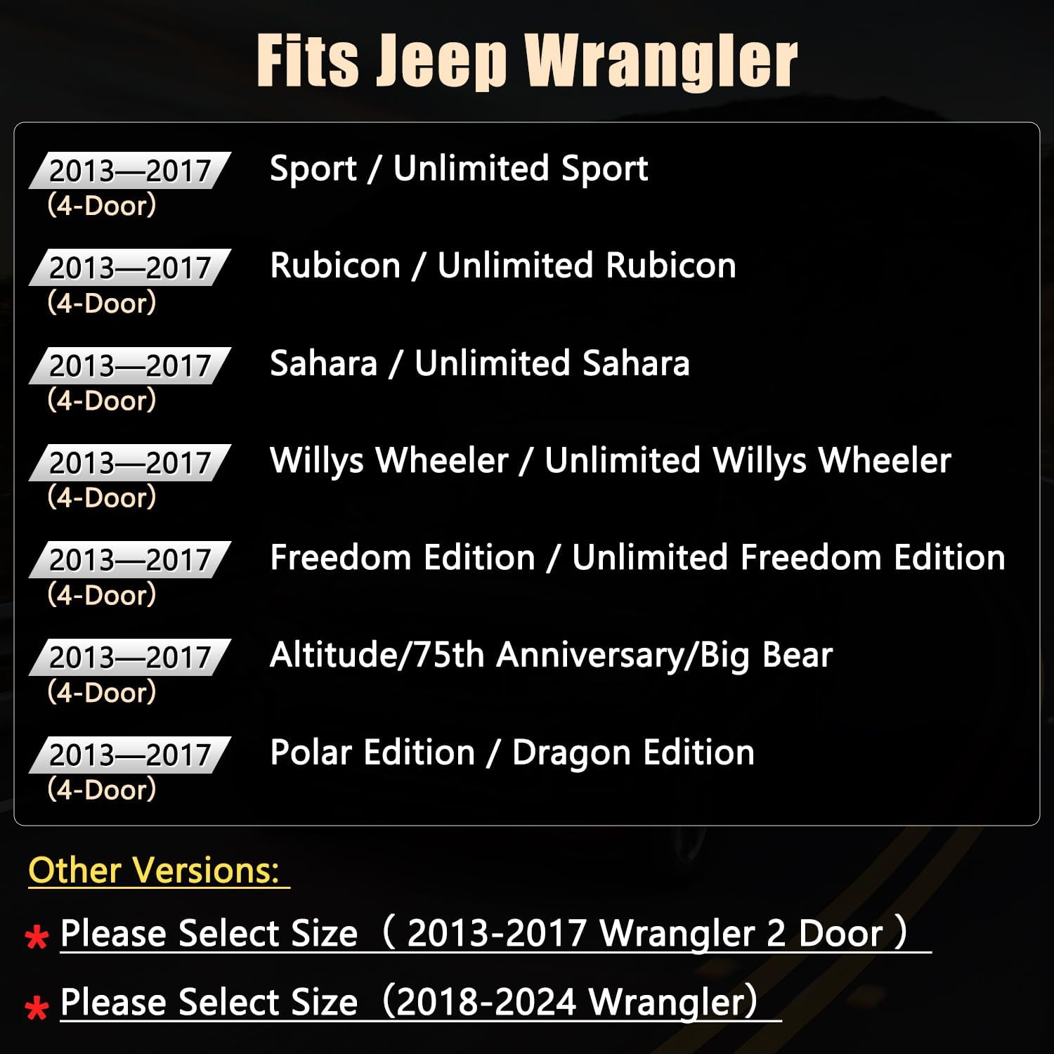 - ăCUSTOM FITă - A full set of seat covers customized according to the original car seat size 1:1, which will fit Wrangler JK 4-Door 2013 2014 2015 2016 2017 like a glove.