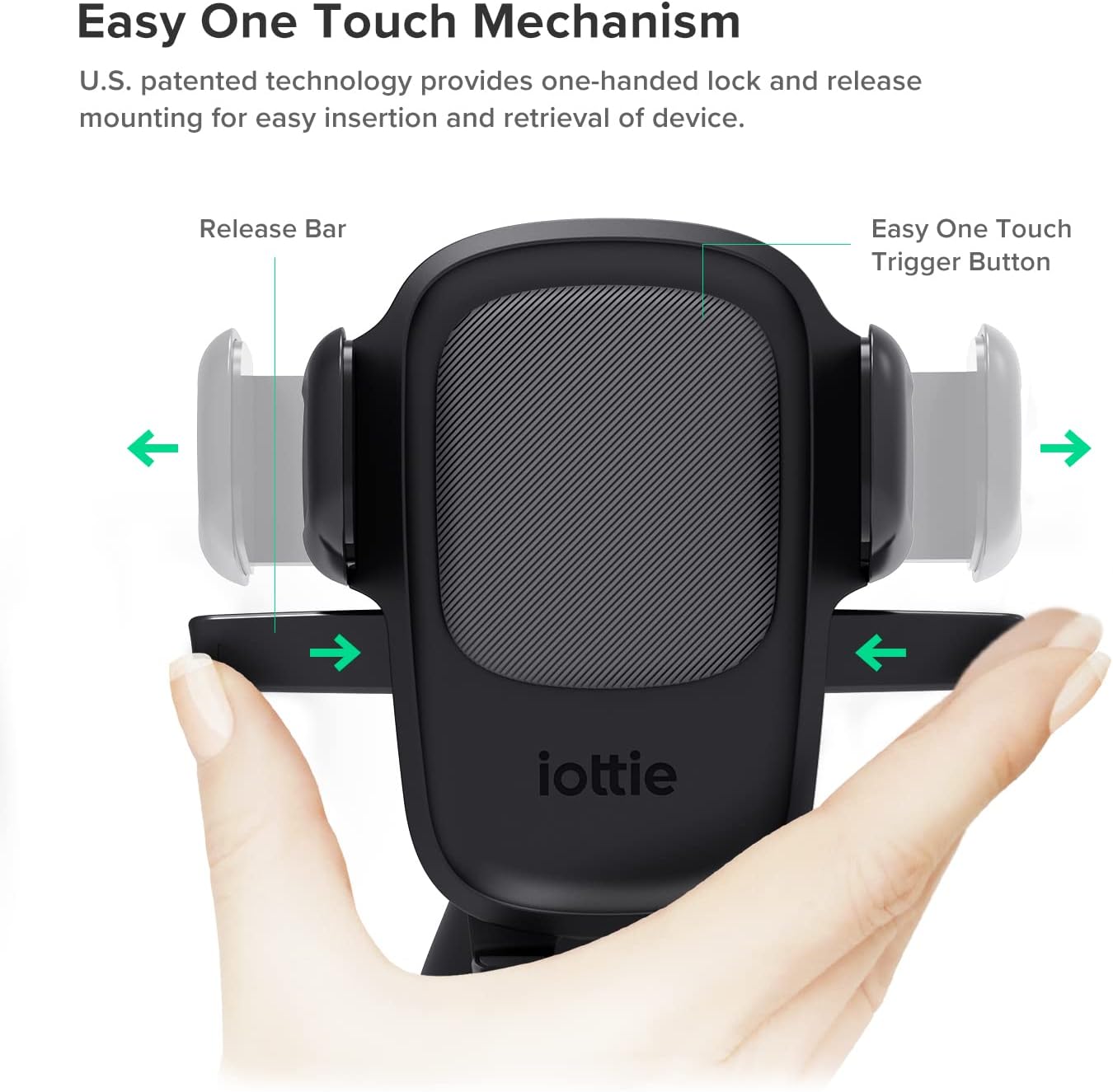 - Product 2: EASY ONE TOUCH MECHANISM: Press the locking side arms with a quick one-handed motion, and place your phone against the trigger button. The mount’s arms will close automatically, holding your device securely while you drive. Mount or remove your phone in seconds with the patented Easy One Touch Mechanism.