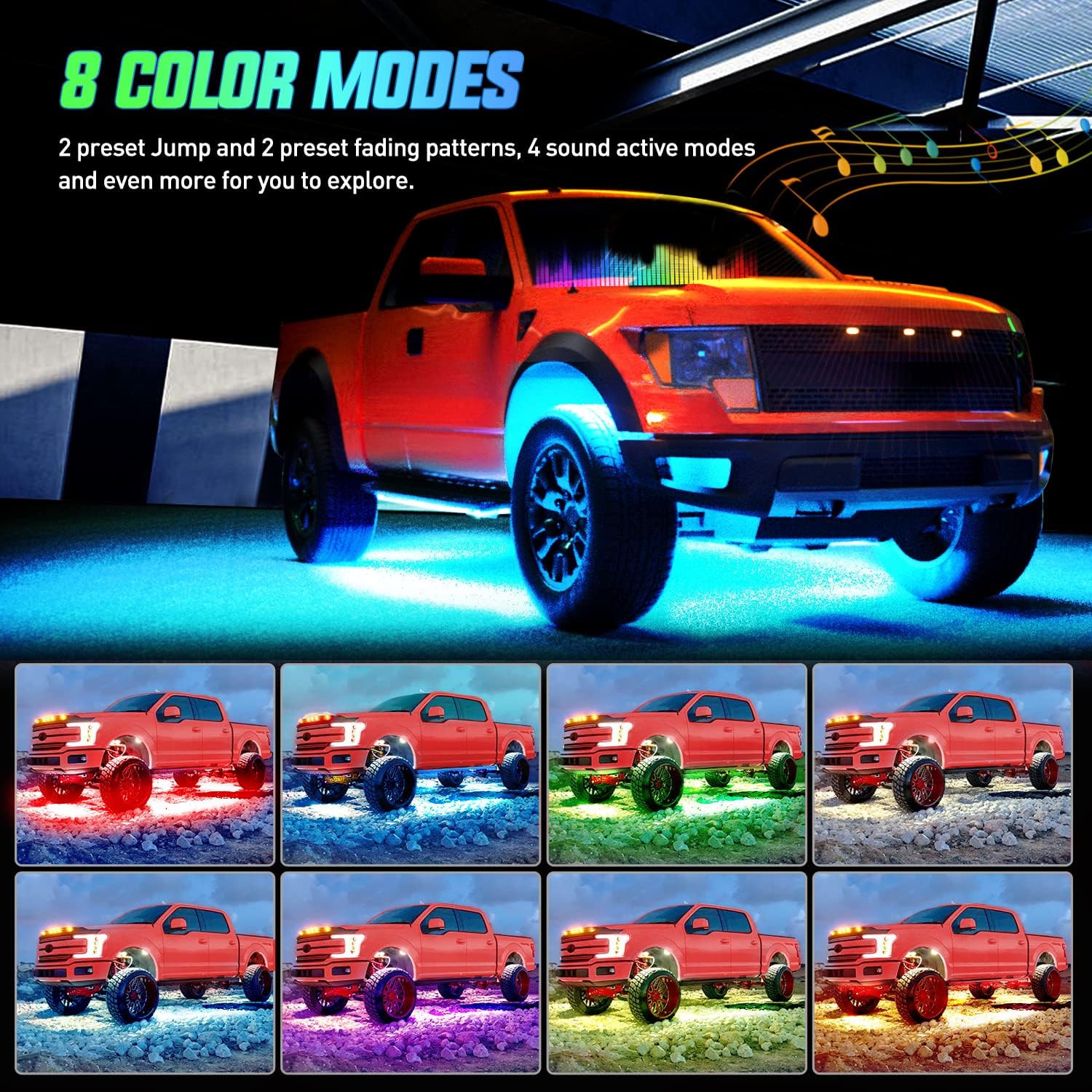 - APP & Remote Control: The app control has 5 functional modes: Multi-color-DIY ; Music Mode; Rhythm; Function Mode Option; Timing Function. It can create custom 16 million colors. The remote control has 8 static lighting modes, 2 preset Jump and 2 preset fading patterns, 4 sound active modes and even more for you to explore. Various modes can be switched at will, give you an amazing visual and auditory experience.