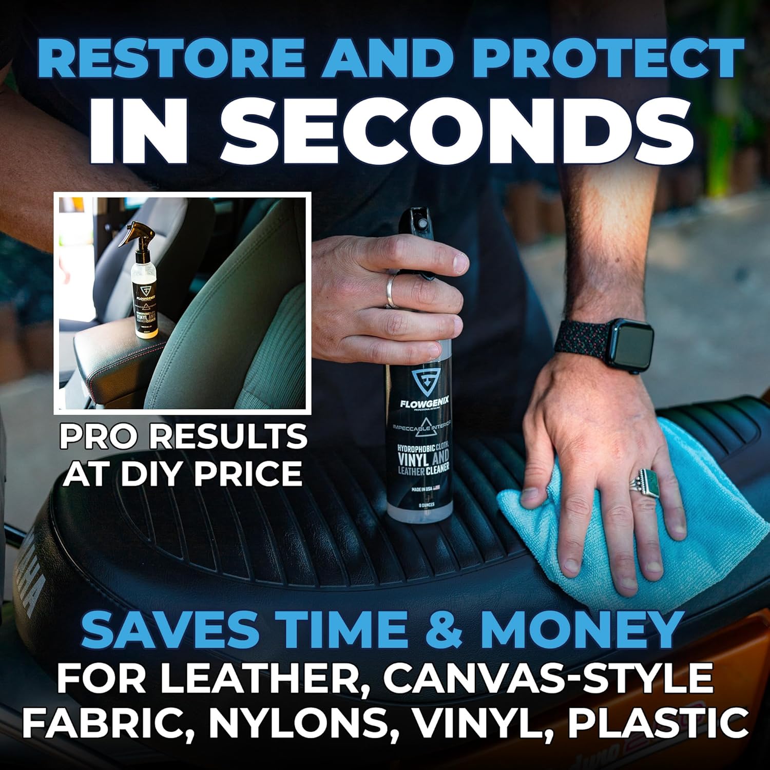 - β INTERIOR PROTECTION: Flowgenix Impeccable interior car cleaner adds a protective coating that will repel water, stains and scratches from your leather, canvas-style fabric, nylons, or vinyl. Comes with 2 complementary edgeless Premium Microfiber Towels (380 GSM, 16x16 inch) for safe and effective detailing application, and drying.