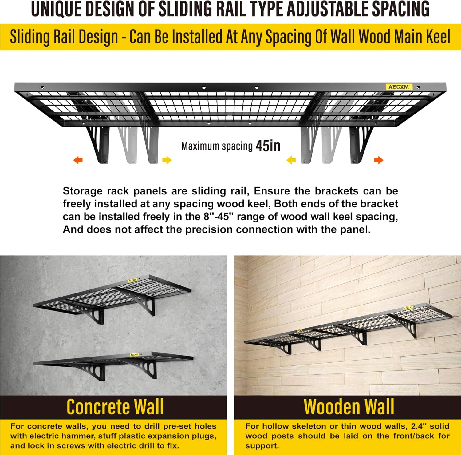 - Innovative Design: Unlike fixed-spacing systems, Aecxm garage storage shelves wall mounted feature sliding rail screws, allowing installation on wood studs spaced anywhere within the 48-inch garage shelf length. No more compatibility issues with uneven stud spacing