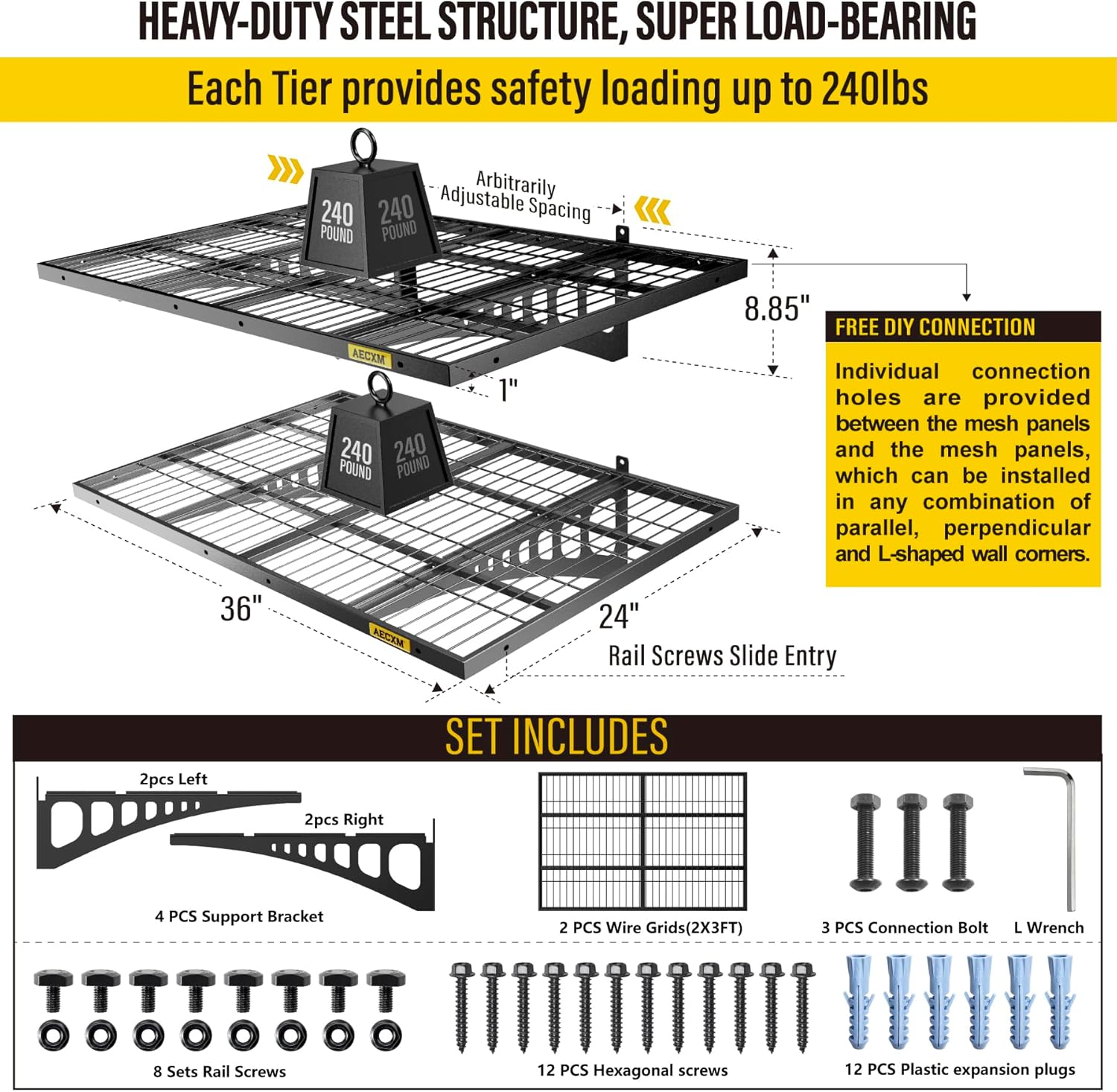 - 【560lbs Load Tested】Our garage wall shelves undergo rigorous testing, with each individual unit supporting 280 lbs. The 2-pack (2x3ft) offers a total weight capacity of 560 lbs