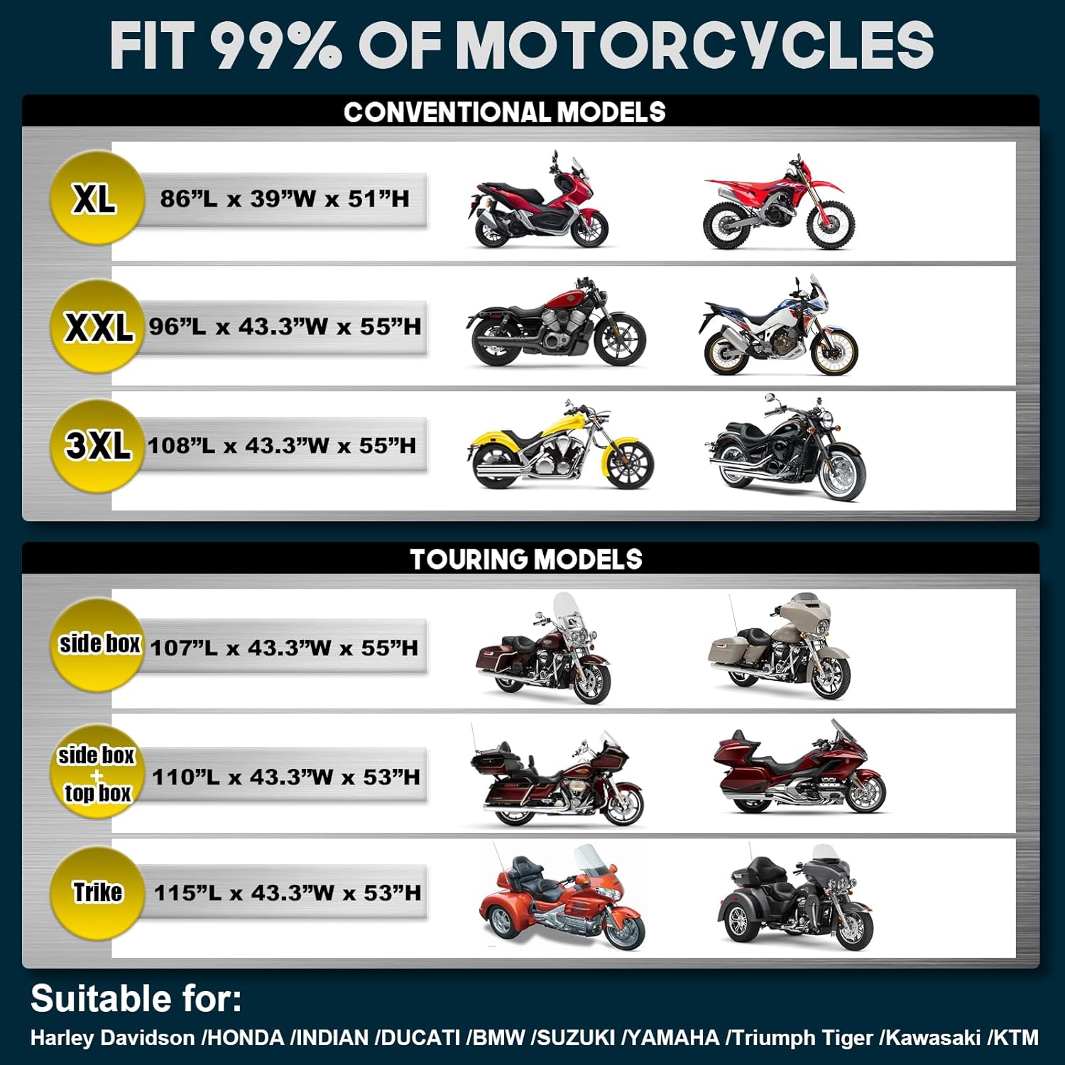 - 【3D CUT】This cover is designed for motorcycle models with side boxes.SIZE: 107"L * 43"W * 55"H,Suitable for most motorcycle of touring models,such as Harley Davidson ,HONDA,INDIAN,DUCATI,BMW,SUZUKI,Triumph Tiger,KTM,YAMAHA,KAWASAKI.