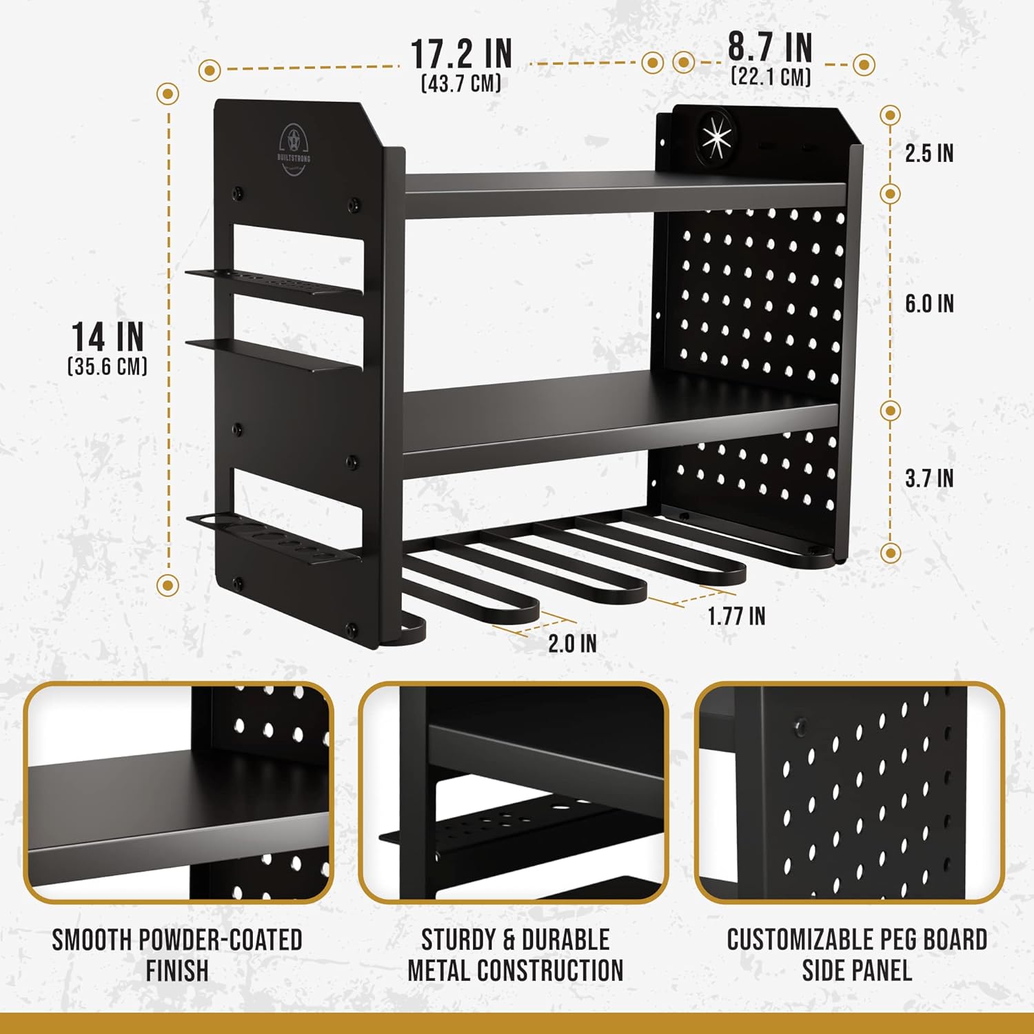 - PROFESSIONAL-GRADE DURABILITY let our tool organizers and storage shelves serve you for years on end. With a high-quality metal construction and beautiful powder-coated finish, this power tool holder stores, organizes, and looks great while doing it