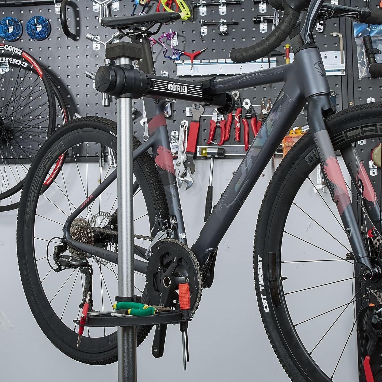 - ๐๐ฎ๐ซ๐๐๐ฅ๐ & ๐๐ญ๐๐๐ฅ๐ ๐๐ฅ๐๐ญ๐๐จ๐ซ๐ฆ - The Corki Cycles bicycle maintenance work stand is built from a strong yet durable aluminum alloy. In the construction we focused on all the general weaknesses of other bike stands on the market. We reinforced areas where they lacked to produce a stable, strong, durable bike stand. Our bike stand can withstand the weight and force of your bike even during difficult maintenance tasks. Adjust the tripod stand wider for a heavier downhill bike.