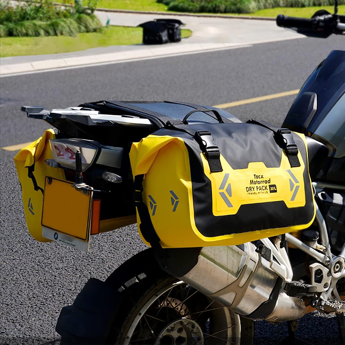 - Large Capacity:Each side of motorcycle rack bag has a large capacity of 30L, and the total of 60L on both sides is enough for most of your belongings. There is also a zipped pocket on the inside of the bag for your electronics and other small valuables.