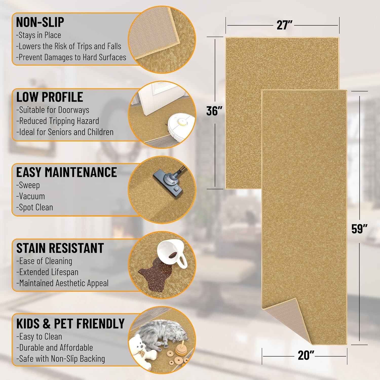 Ottomanson 2-Piece Kitchen Rug Set - Non Slip, Runner & Small Area Rug - Solid - 20" x 59" & 2'3" x 3' - Durable, Stain Resistant for Entryway, Bedroom and Bathroom, Beige