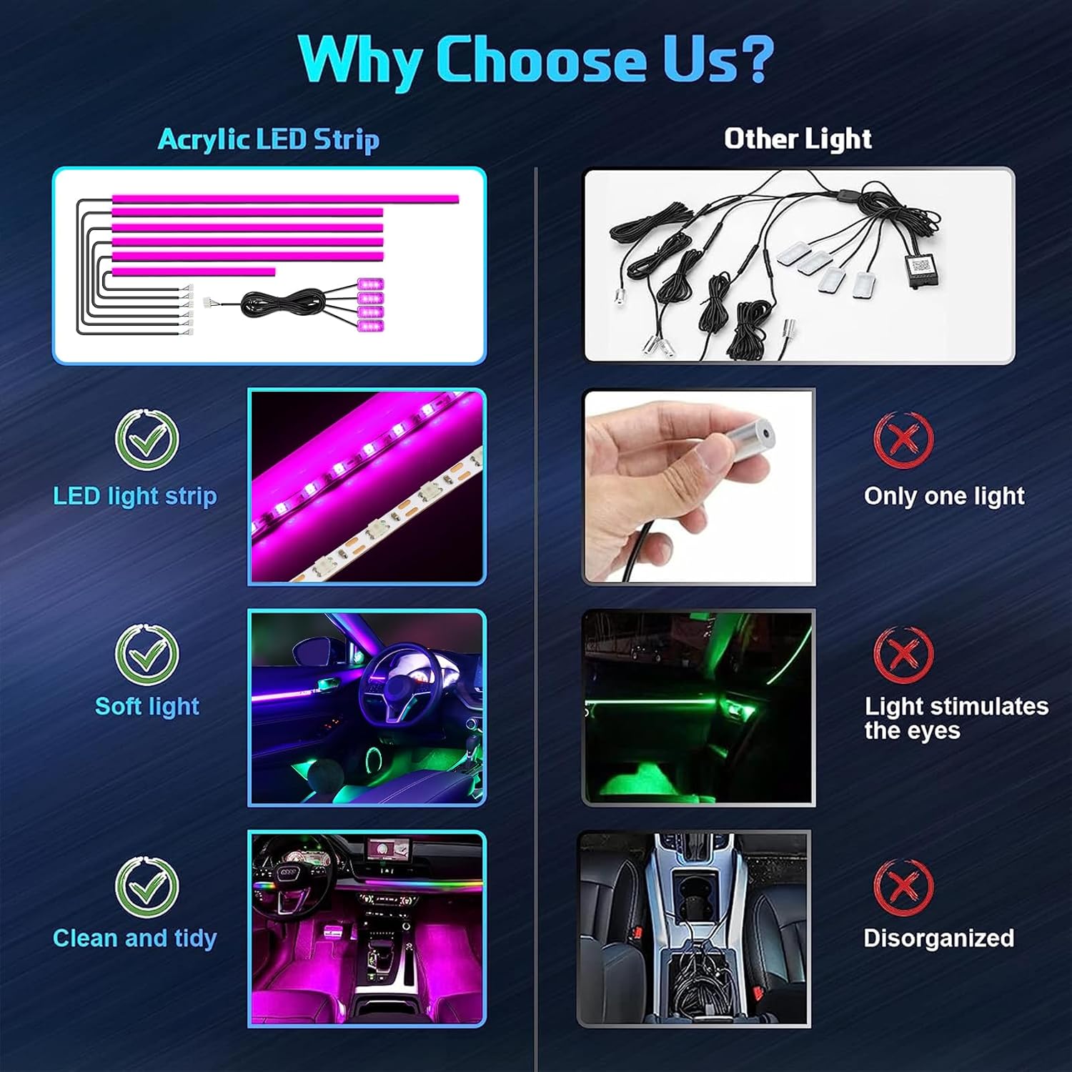 - ăUpgraded Acrylic 10-in-1 Car Ambient Lightă This interior car LED light consists of 6 acrylic fiber optic light strips(1*14inch+4*29inch+1*43inch, with 593 LEDs), 4 under dash lights, one master controller and 4 slave controller, which can be flexibly installed in any car without clutter.