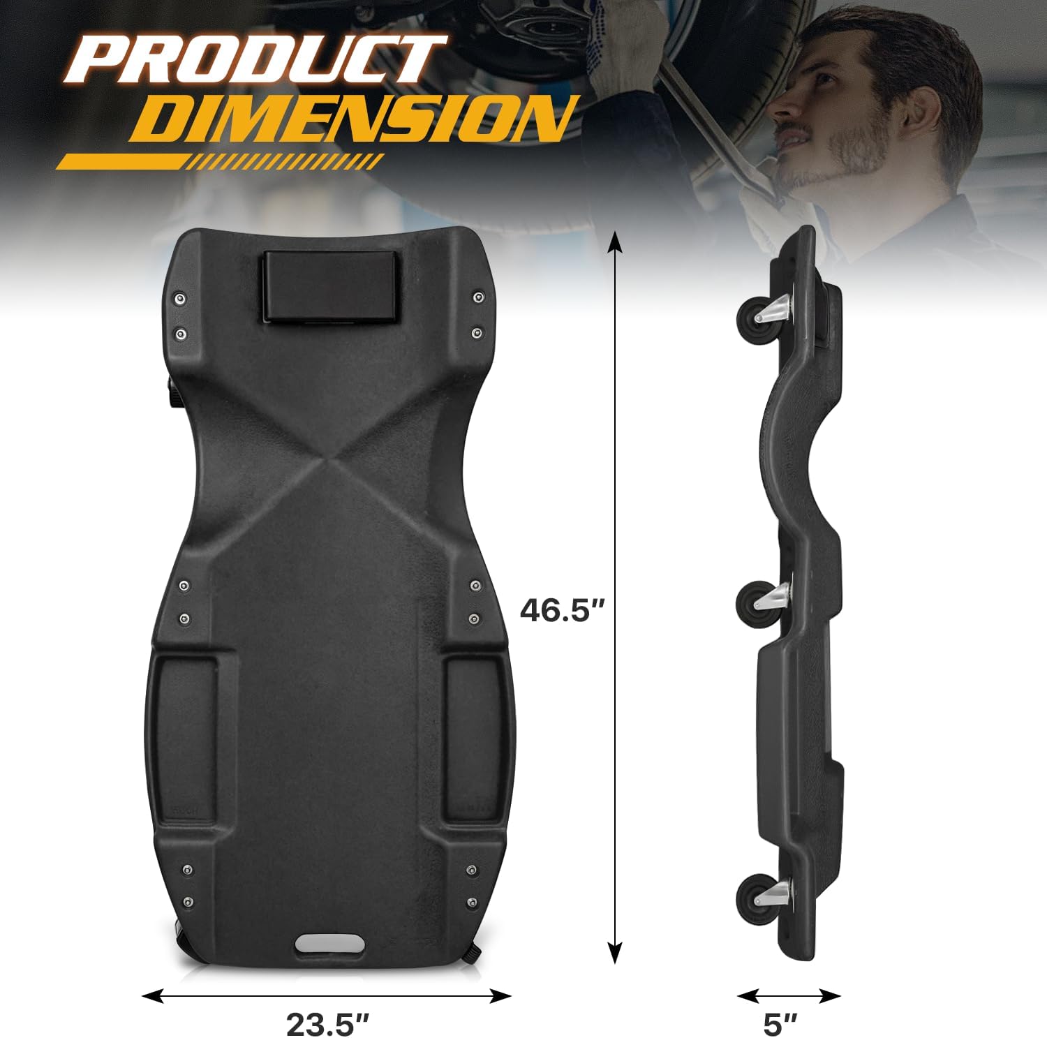 - The creeper measures 23.5"(D)×46.5"(W)×5"(H), has six 2.5" diameter wheels, and tool trays on both sides for your convenience.
